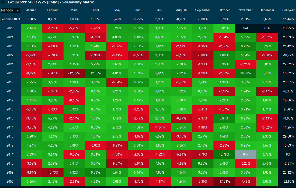 En analys från Crescit för perioden 1987-2024 visar att OMXS30 haft en genomsnittlig månatlig avkastning på ca +1,65 % under perioden november–april, medan perioden maj–oktober har legat på ungefär 0,00 %. Såklart stämmer det inte varje år att november-april innebär stark börsutveckling, men över längre tidsperioder syns helt klart den inneboende säsongseffekten i marknaden.