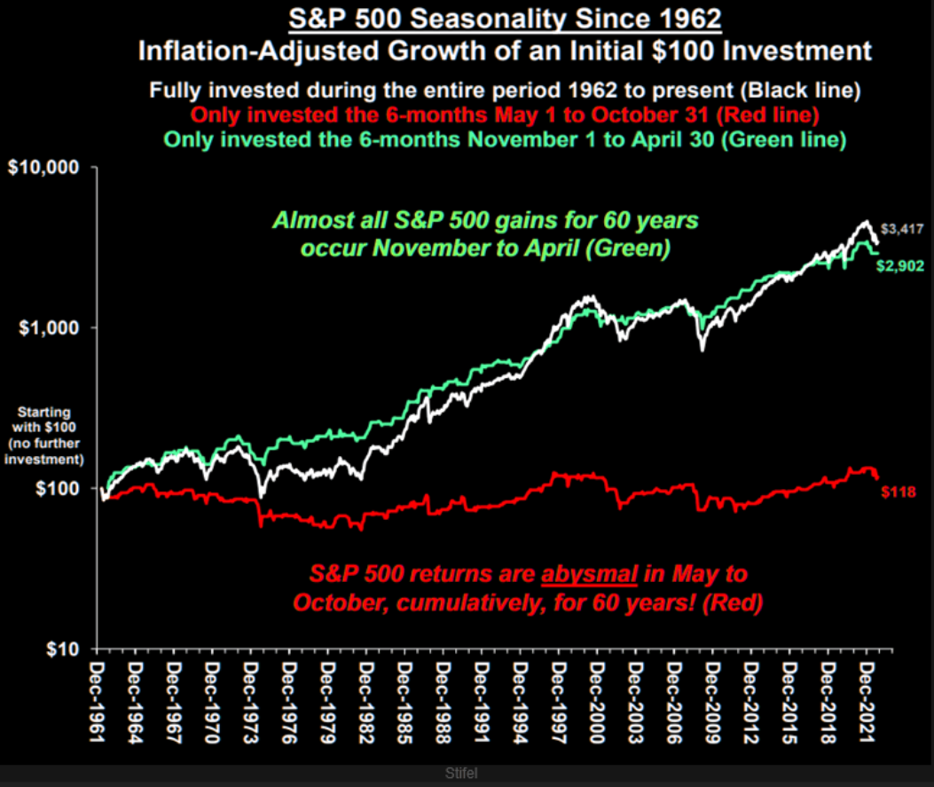 Exemplet nedan ger en tydlig visuell bild över börsens säsongseffekter. Om man endast ägt S&P 500 under perioden november – april varje år från 1962-2022 skulle den strategin gett +2900% i avkastning och vara i stort sett lika bra som “buy and hold” hela året. Således genereras i stort sett all årets avkastning under denna period. Om man istället ägt S&P 500 enbart under perioden maj-oktober skulle den strategin ha gett totalt +18% på 60 år (!).