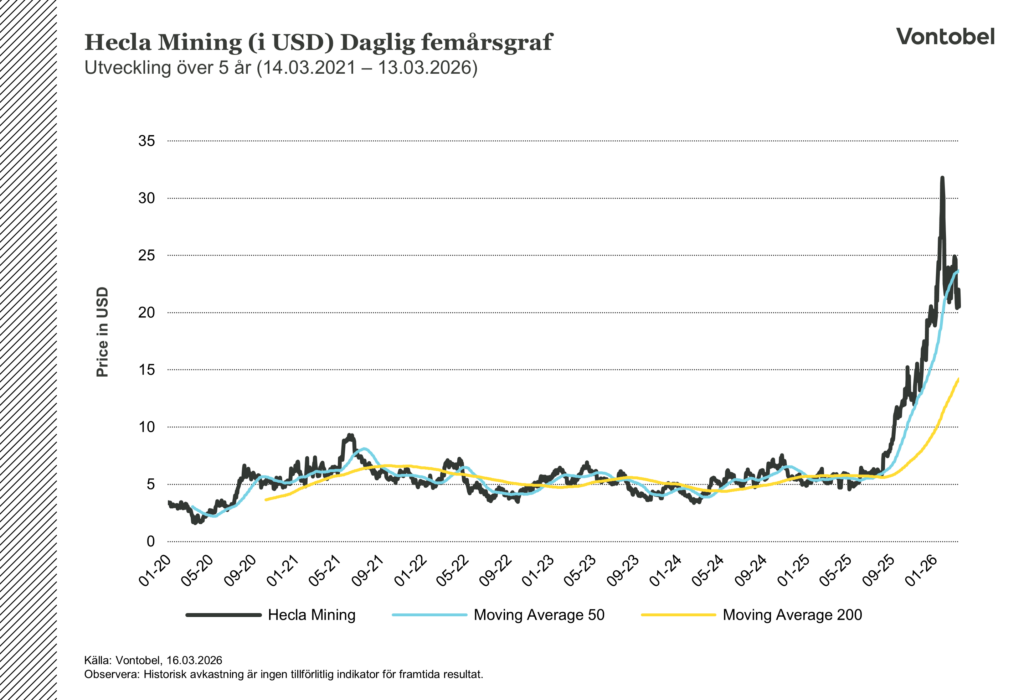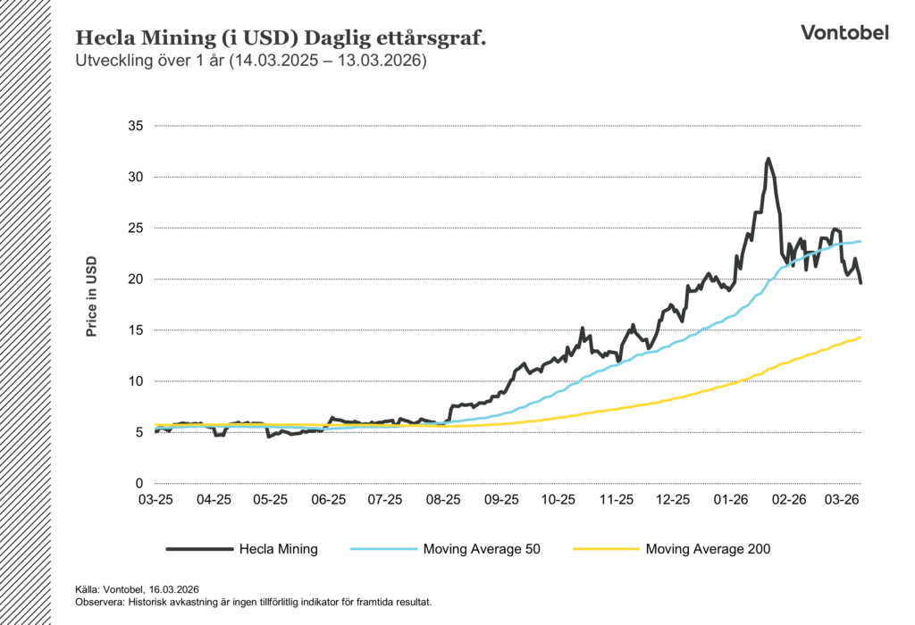 Aktien har reagerat i linje med vändningen. HL steg från runt 5,40 dollar i början av 2025 till 22 dollar i mars 2026, en uppgång på över 300 procent. Kursen nådde en all-time-high på 31,80 dollar den 23 januari innan den korrigerade i samband med silverprisets reträtt i februari. Börsvärdet ligger på ungefär 14,75 miljarder dollar. Inför 2026 guidar ledningen för en silverproduktion på 15,1 till 16,5 miljoner uns, en måttlig nedgång som speglar lägre förväntade halter vid Greens Creek.