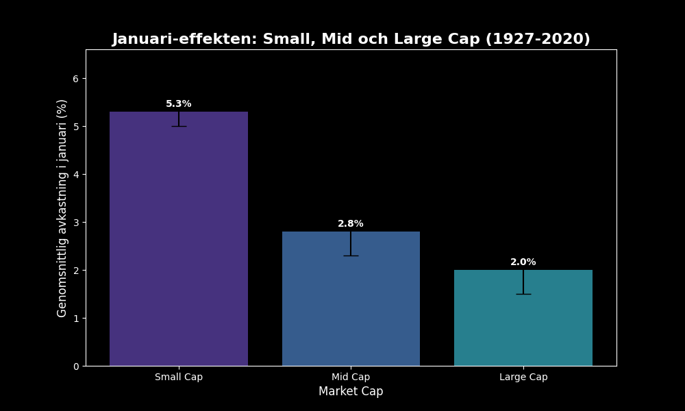 Under januari köps dessa aktier tillbaka in i portföljerna. Mer likviditet kommer in och många är sugna på att ta mer risk igen. Riskbudgeten öppnas upp för fonder och institutioner som varit tvungna att hålla låg risk inför årsslutet. Småbolagen gynnas stort av detta och har överpresterat både mid/large caps flera decennier tillbaka. Diagram med data från Seasonax.