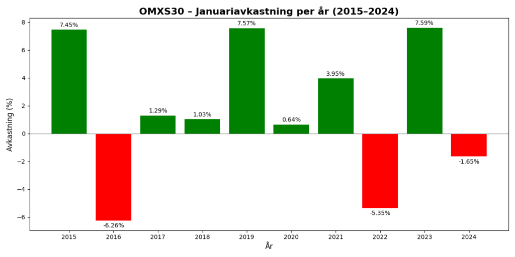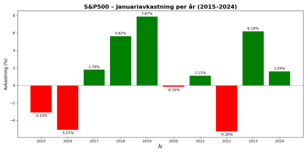 Historiskt har starten på januari generellt sett varit stark. Investerare har fått sina årsbonusar utbetalda och är sugen på att handla igen. Många har fått ledigt från börsen ett par veckor och fokuserat på annat. Men det börjar krypa i fingrarna igen. Efterfrågan på aktier ökar och likviditeten kommer in till marknaden igen. Men hur har januari avkastningen sett ut de senaste åren? Vi tar och tittar på utvecklingen under 2015-2024, både på S&P500 och OMXS30. Diagram med data från TradingView.