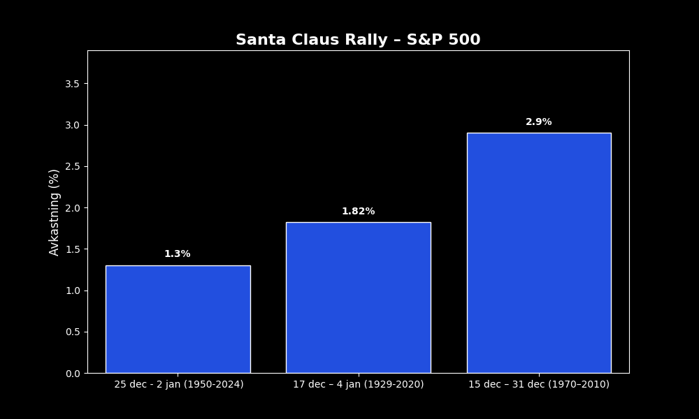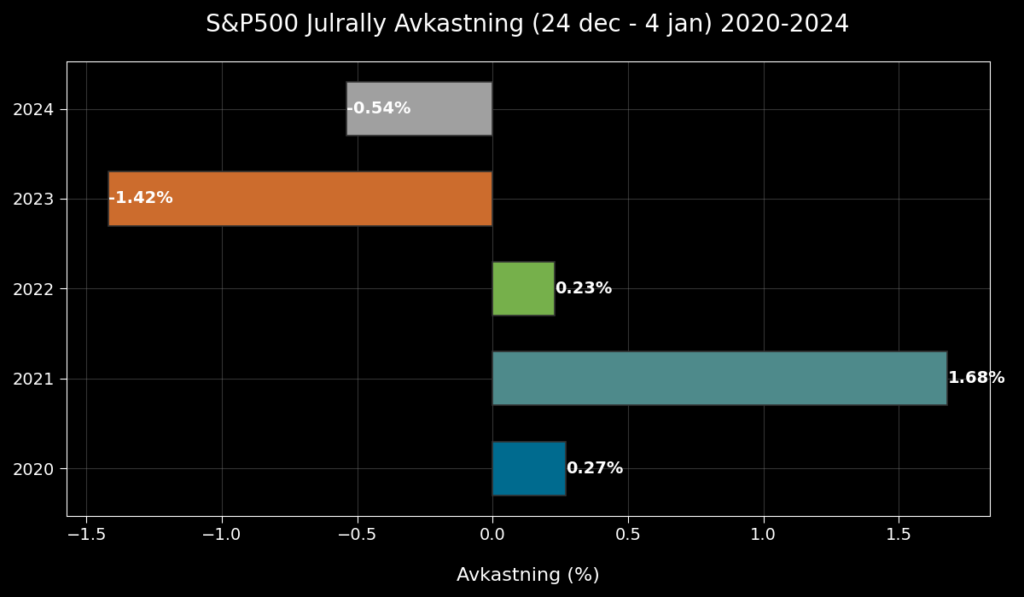 Den psykologiska biten är fortfarande kvar, men de senaste åren har visat ett svagare mönster under tomterally tider. S&P500 2024 (-0.54%), 2023 (-1.42%), 2022 (+0.23%), 2021 (+1.68%), 2020 (+0.27%). Senaste 5 åren har alltså haft en snittutveckling på 0,04%, inte direkt någon garanti på större tomterally. Generellt är sentimentet under denna perioden mer positivt på grund av den gamla historien. Men det är ingenting som garanterar lika stabila och starka avkastningar som förr.
