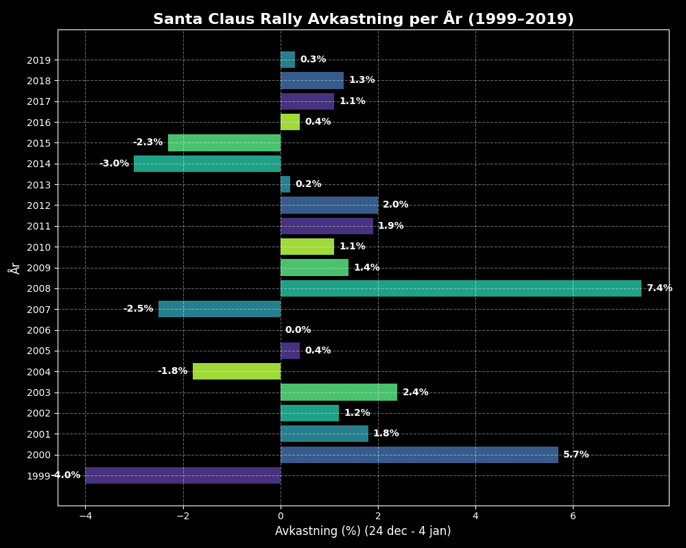 Under dessa 20 år (1999–2019) var snittavkastningen ungefär 0.92%. Då måste man också tänka på att från 24 dec till 4 jan, brukar det bara vara runt 4-5 öppna handelsdagar. Alltså ett riktigt bra snitt på den korta perioden. Jämförelsevis i Sverige, har OMXS30 haft en genomsnittlig avkastning på 0,38% under samma period. Hela Stockholmsbörsen visar allmänt ett svagare säsongsmönster runt årsskiftet än USA.