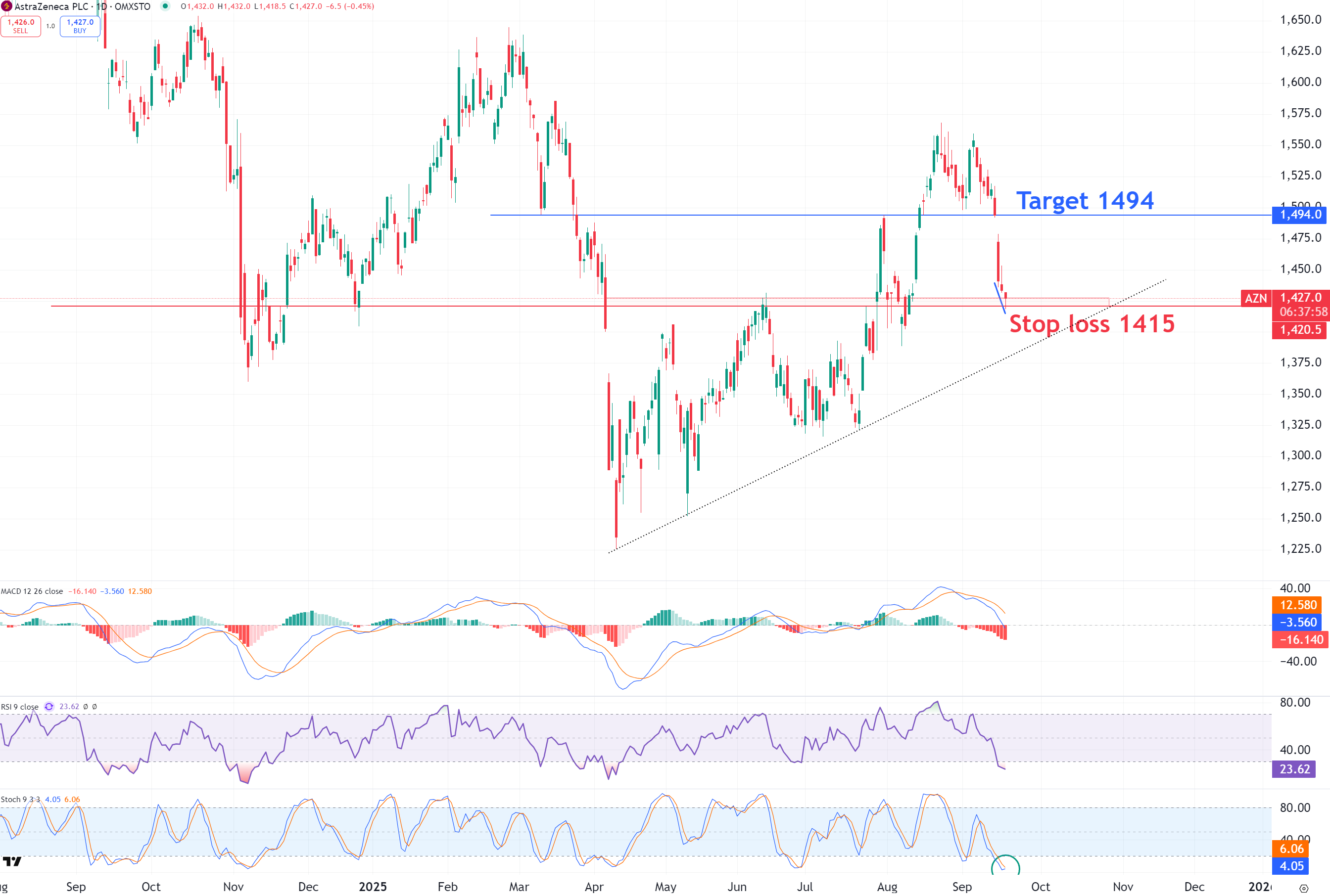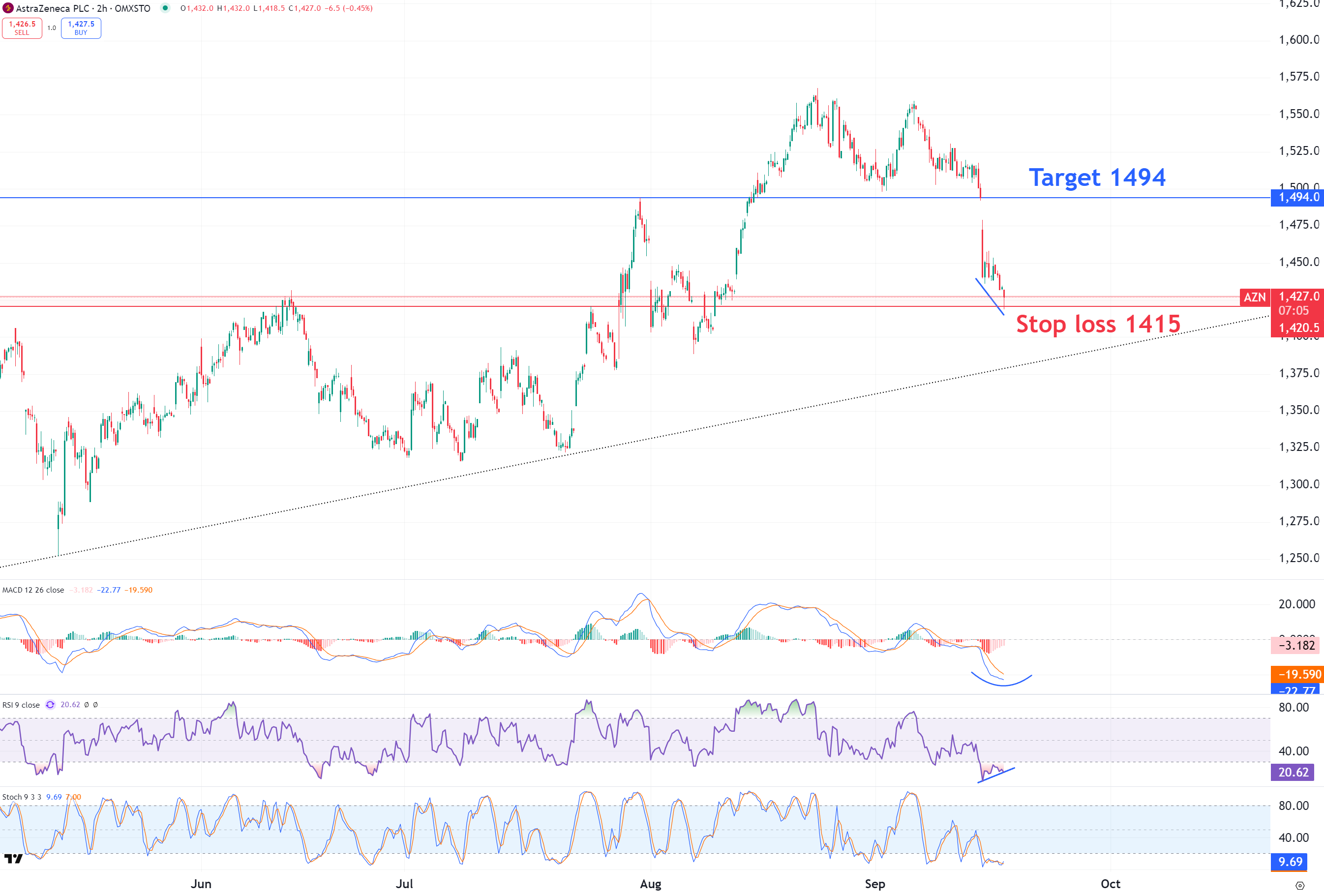 Sedan förra veckans högsta nivå är nu aktien ner -6,7 % och -9% sett från toppen i slutet av augusti. Rent tekniskt har aktien ett viktigt stödområde här vid 1427-1420 kr och uppvisar nu positiva divergenser i 2h chartet och är kraftigt översåld i 4h samt i daily chartet.