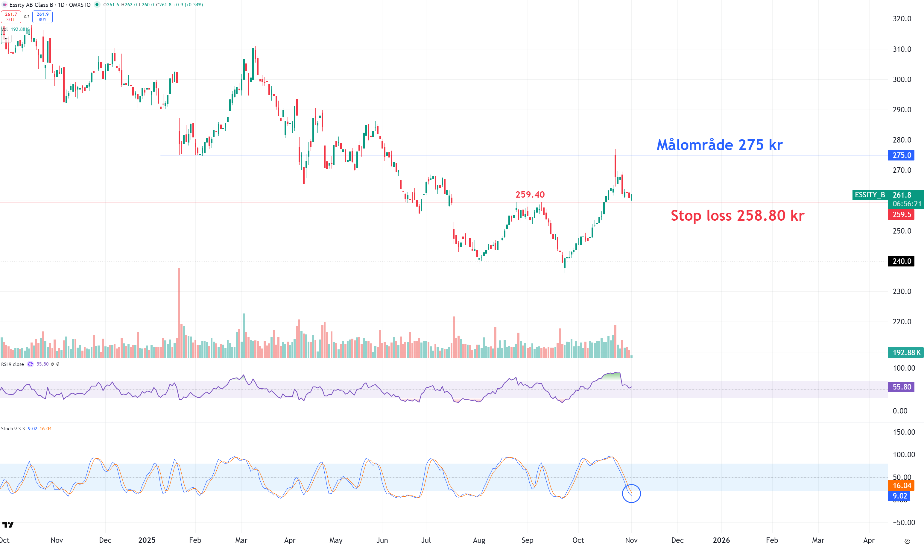 Essity steg totalt +12 % fram till rapporten på starka handelsvolymer och även om rapporten var positiv med bättre resultat och bättre marginaler än väntat, orkade inte aktien högre utan vände nedåt efter en stark öppning den dagen (23 okt). Sedan toppen vid rapporten är nu aktien ner -5,4 % och möter starkt stöd här vid 260/259 kr. En välbehövlig paus! Vi väjer att gå lång Essity här med en stop loss strax under 259 kr. På uppsidan ser vi 275 kr som målområde senare i november.