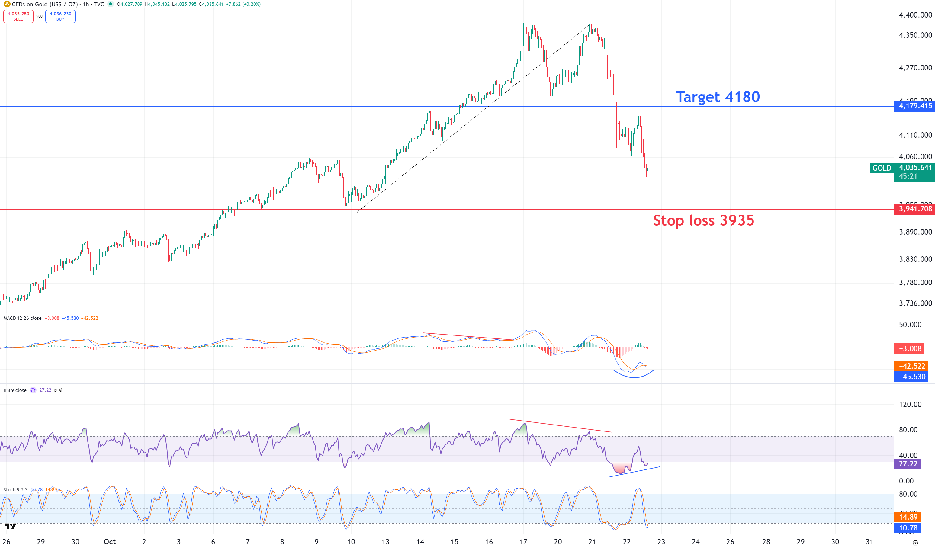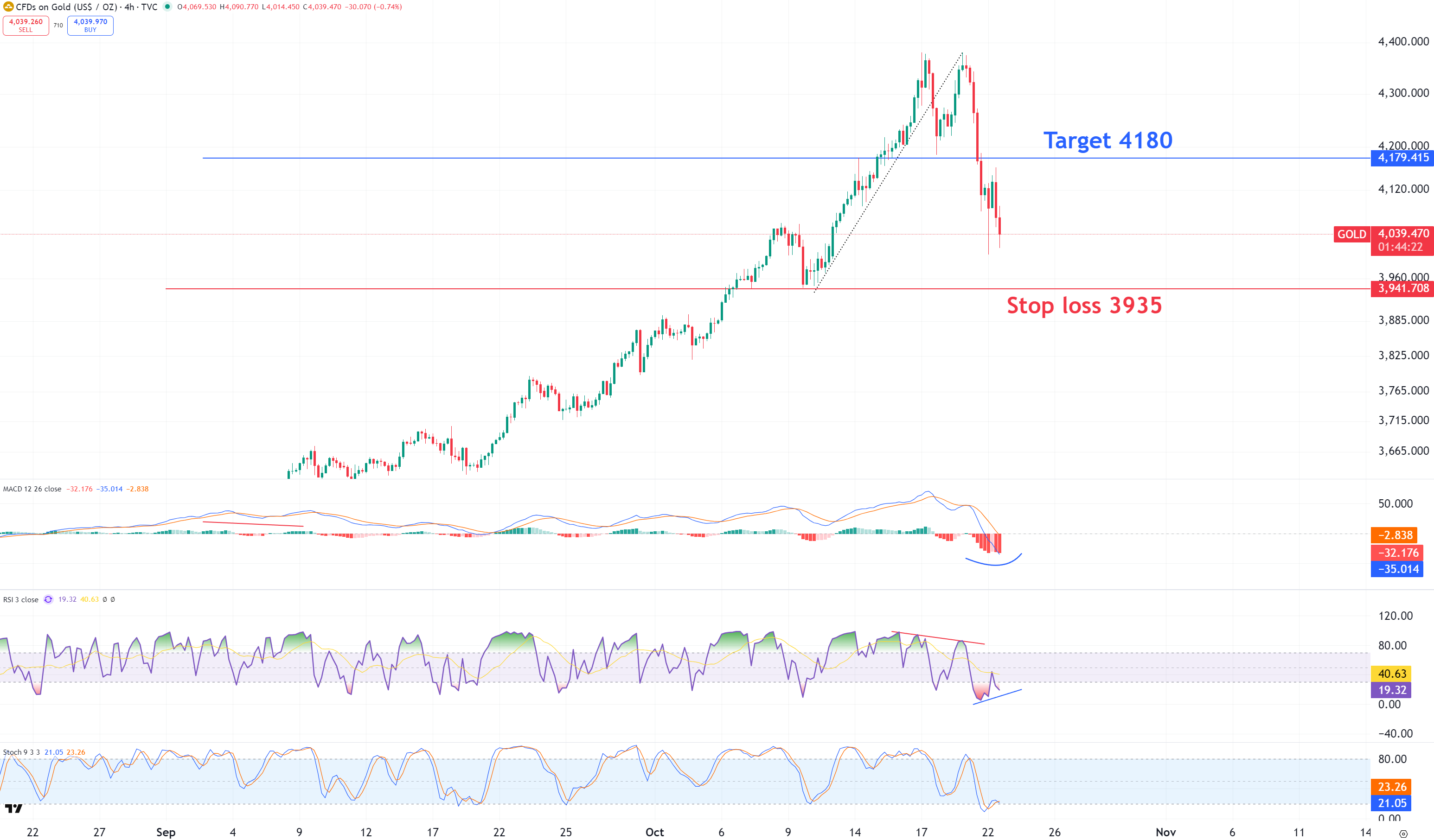 Vi sätter vår initiala stop loss till 3935 usd (-2,10 %), vilket är strax under stödområdet på 3940 från början av oktober. På uppsidan ser vi 4180 usd (+3,98 %) som target på 2-5 dagar.