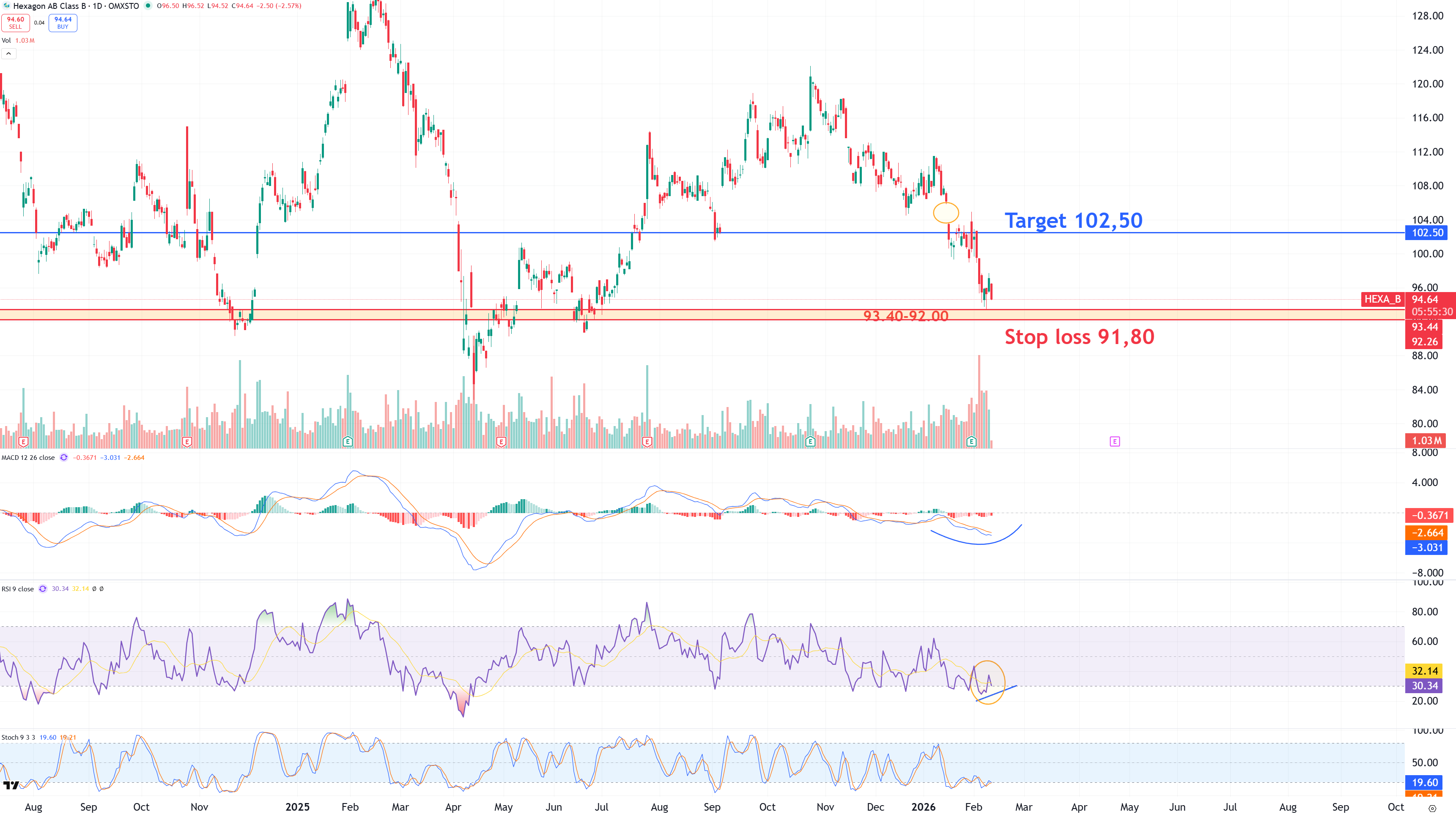 Rent tekniskt ser vi positiva divergenser i daily chartet under uppbyggnad och i veckodiagrammet har inte RSI varit så här pass översåld sedan april 2025. Vi går emot svagheten och sätter vår stop loss i detta affärsförslag till 91,80 kr (-3,10 %), vilket är strax under det historiska stödet på 92,00 kr. På uppsidan ser vi 102,5kr (+8,20 %) som målområde i affärscaset.