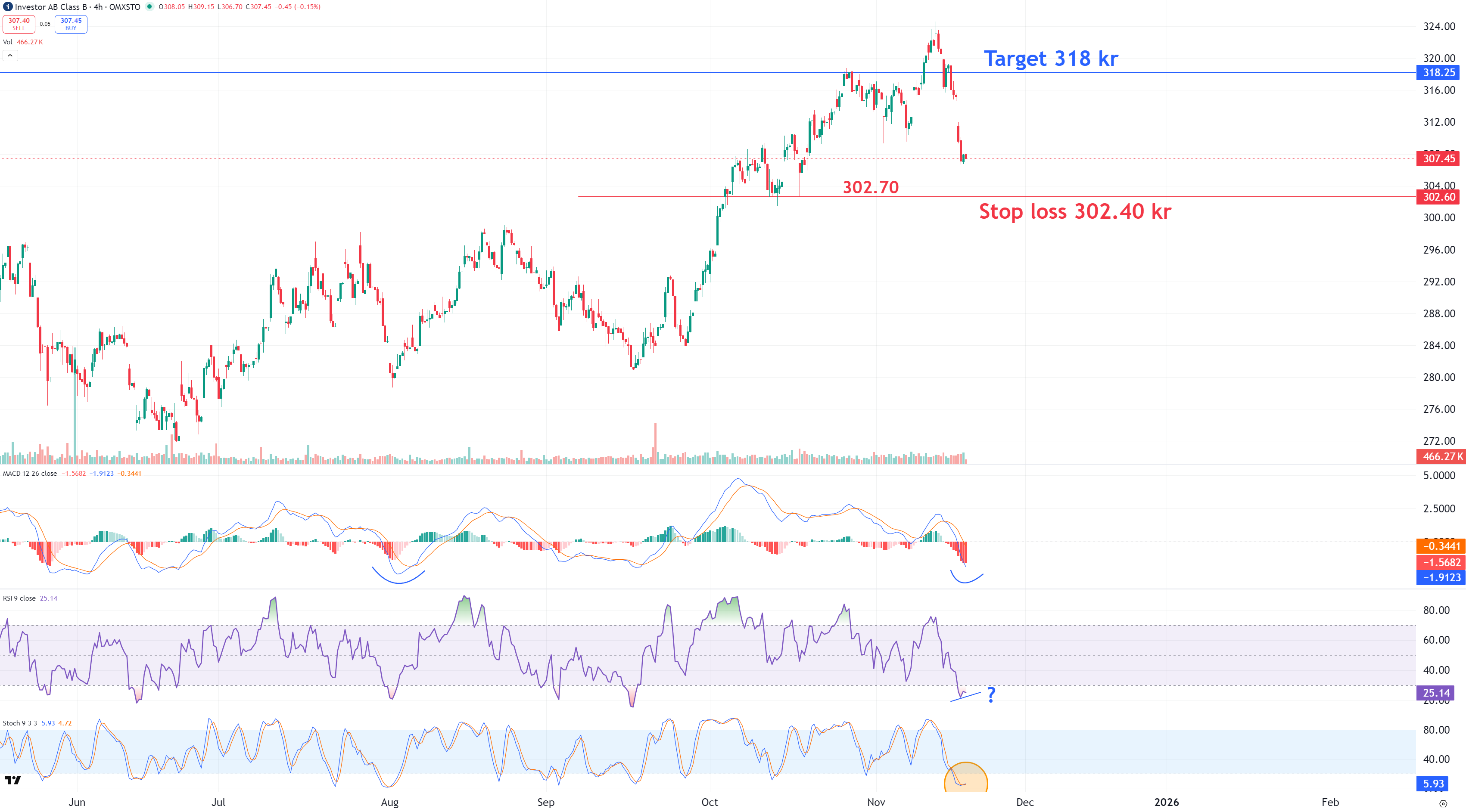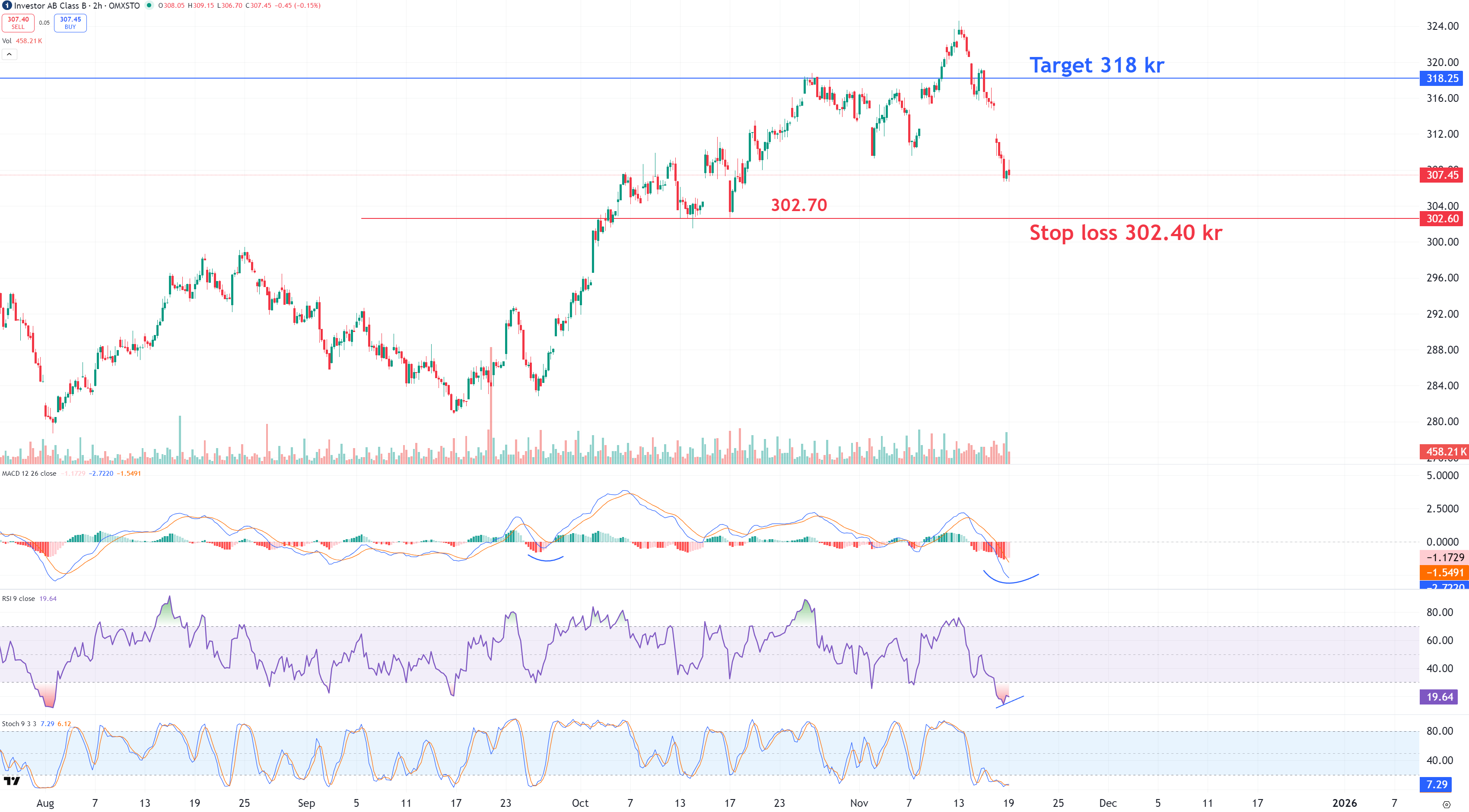 I mitten september lanserade vi ett köpcase i Investor som stängdes i sin helhet 3 oktober med +12,07% i vinst. Sedan i torsdags är Investor ner -5,3 % och vi väljer att gå lång här igen. Aktien uppvisar positiva divergenser i kortare tidsperioder på 1-4h och vi sätter vår stop loss till 302,4 kr, vilket är strax under stödet på 302,7 kr från mitten av oktober. På uppsidan ser vi en bättre bounce kommande veckor mot 318 kr. Det ger en risk på -1,65 % i underliggande aktien och en potential på +3,43 % till målområdet.