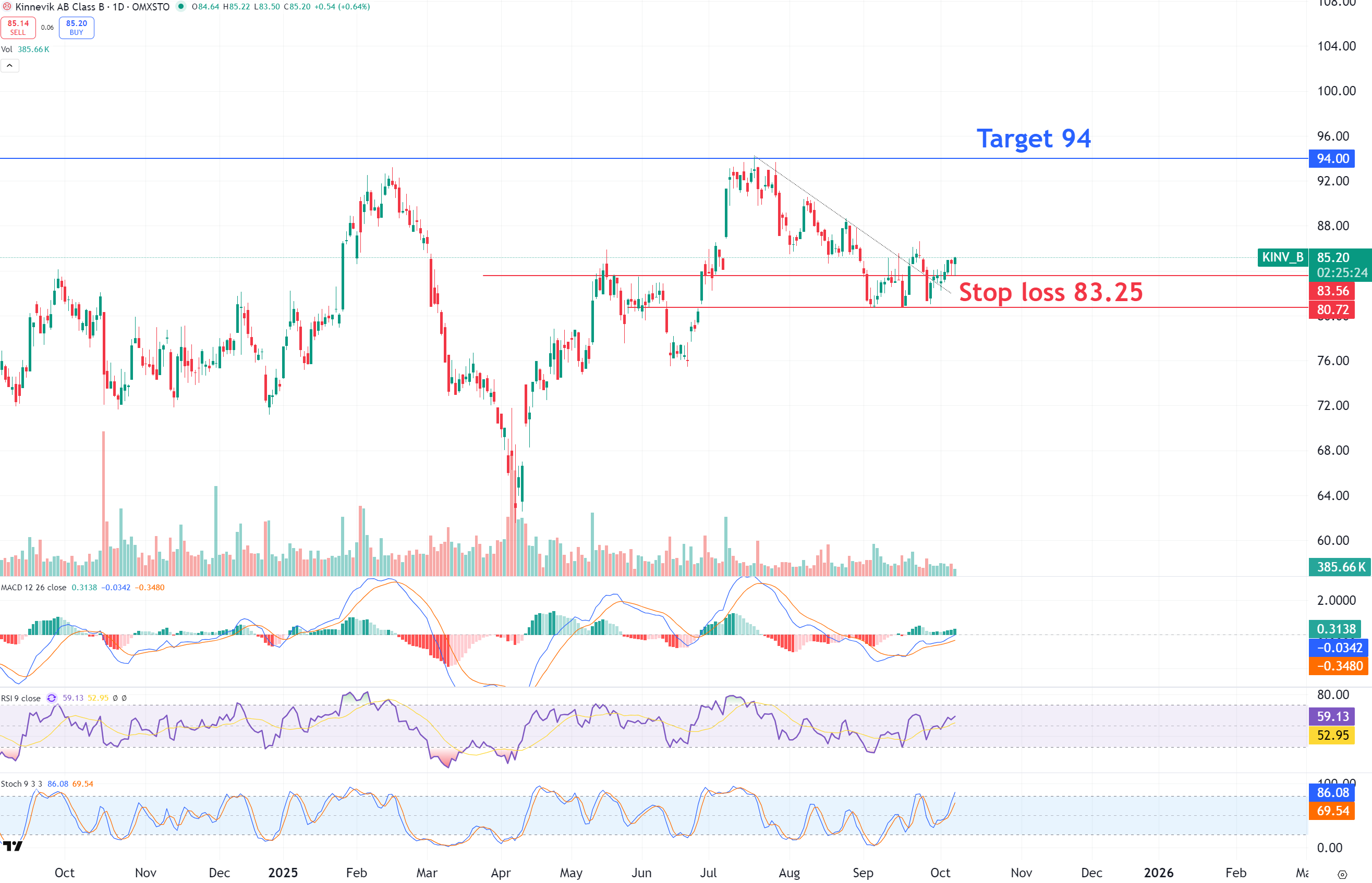 Vi sätter stop lossen tajt till 83,25 kr (-2,30 %) och på uppsidan ser vi återtest av 94 kr senare i Q4 (+10,3 %). Den som vill ha en bredare stop loss kan förslagsvis sätta denna på motsvarande 82,8 kr i aktien.