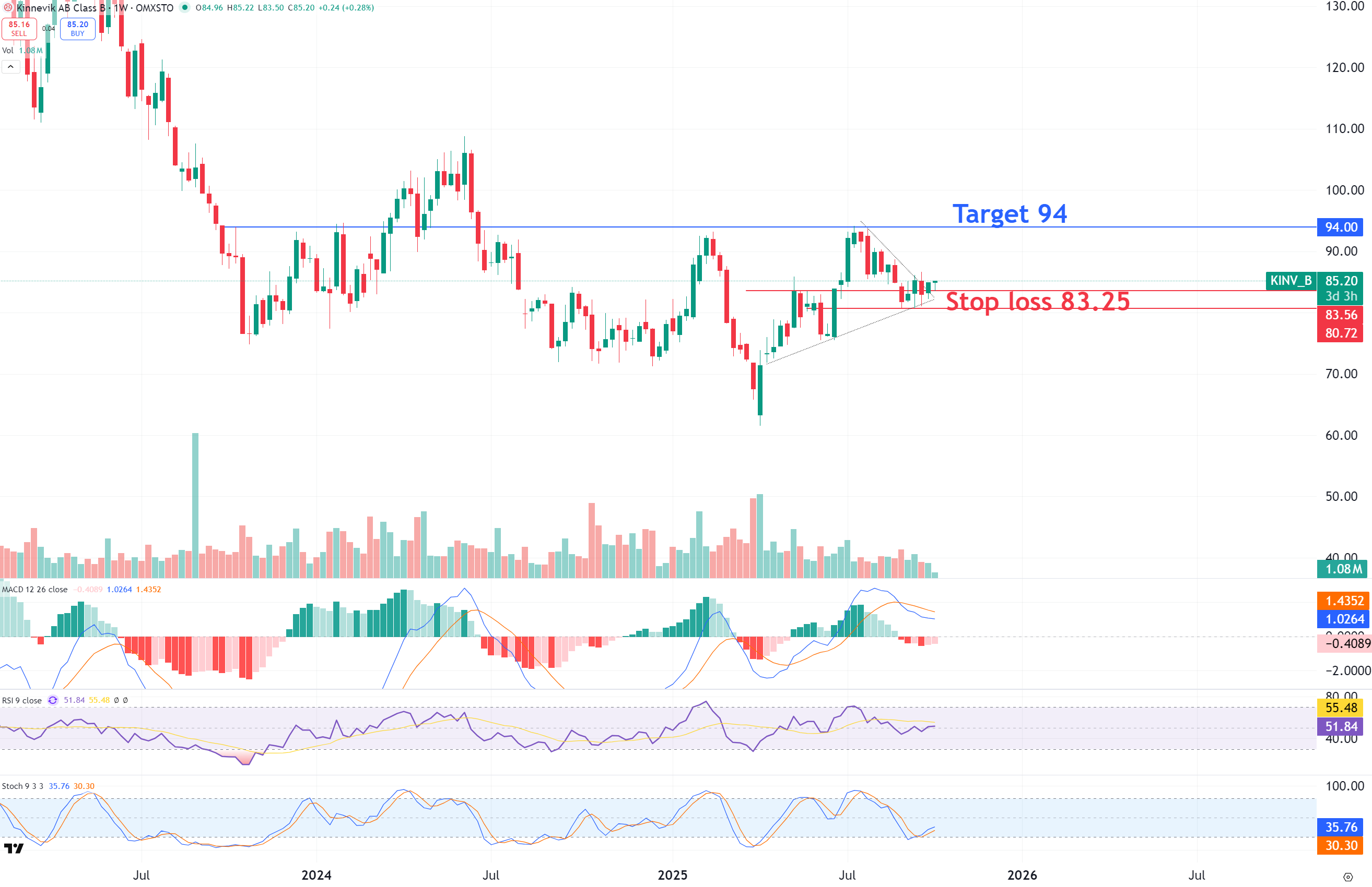 Den 8 september lanserade vi ett köpcase i Kinnevik (här) som totalt sett resulterade i en vinst på +2,7% efter ökad volatilitet i aktien i mitten av september. Nu har dock slagen mellan dagarna mattats av den senaste veckan och köparna ser ut att ha övertaget. Rekyler köps och denna veckan har 83,50 kr fungerat som bra stöd på nedsidan. Aktien har brutit upp ur den nedåtgående trendlinjen från toppen i juli och det förbättrade noteringsklimatet tillsammans med starka uppgångar inom amerikansk “unprofitable tech” bör kunna spilla över på Kinnevik i Q4.