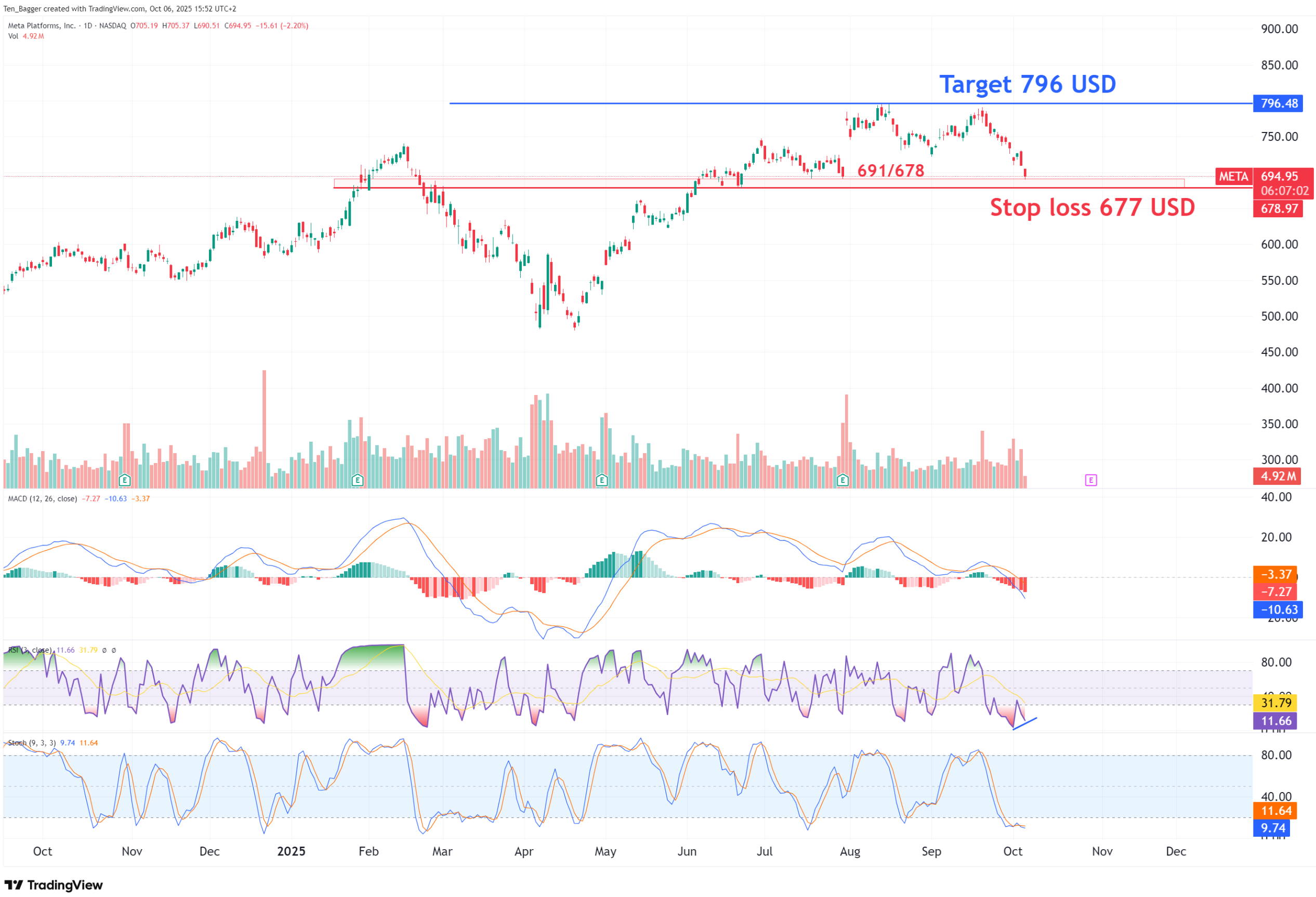 Graf: Meta Daily Chart med positiva divergenser i RSI(3) nere vid stödområde.