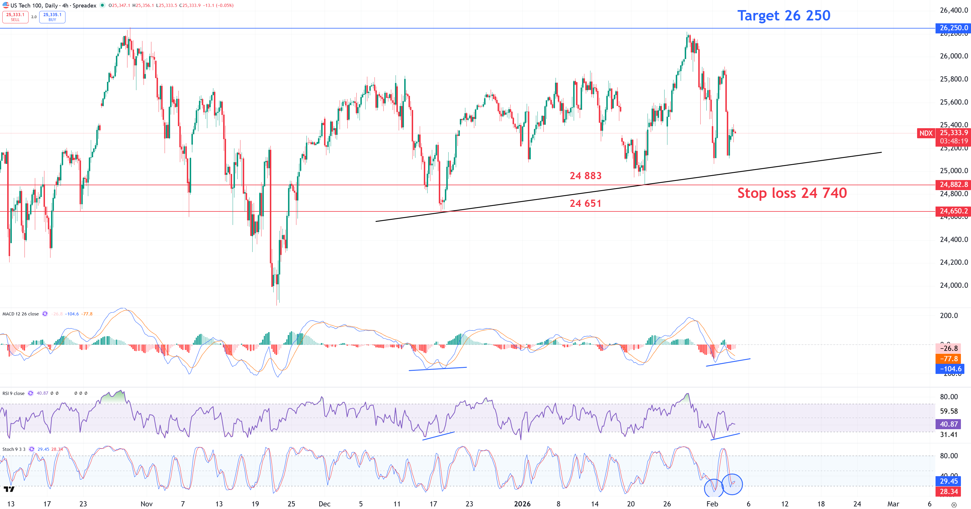 Handeln i Nasdaq 100 präglas av allt högre bottnar sedan den 21a november (se graf nedan) där botten den 21a januari sattes på 24 883. För att ge indexet utrymme sätter vi stop lossen i detta affärscase till 24 740 (-2,40 %), för att undvika att bli utstoppade på eventuell volatilitet i närtid. Ambitionen är att strama åt stop lossen på sikt. På uppsidan ser vi rekordnoteringen på 26 250 som målområde (+3,50 %).