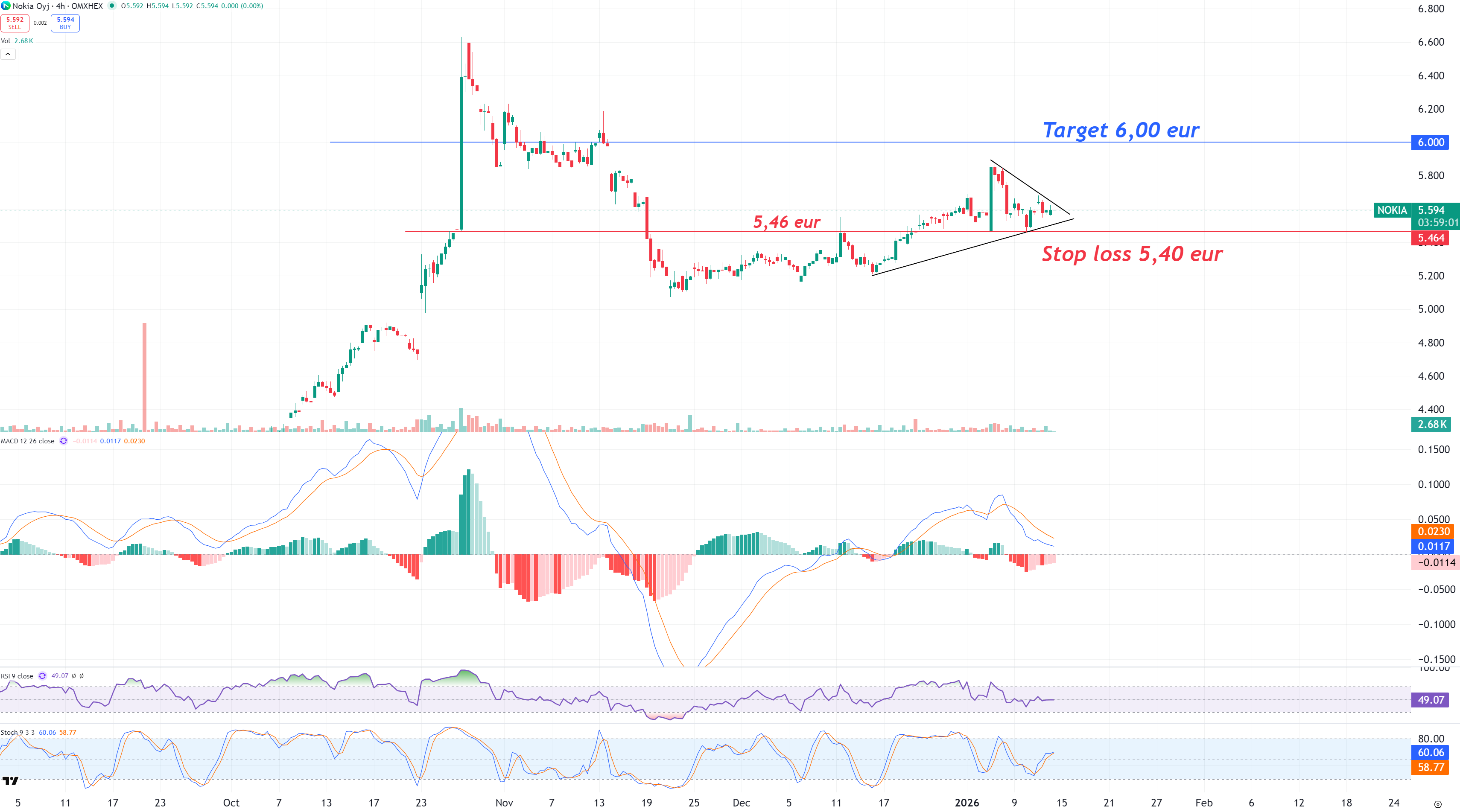 På lägre tidsintervaller som 4h handlas aktien i en intressant kilformation där den senaste veckans rekyl har varit korrektiv. Vi tolkar det som underliggande styrka utan större aggressiva säljare och vi väljer att gå lång Nokia här!