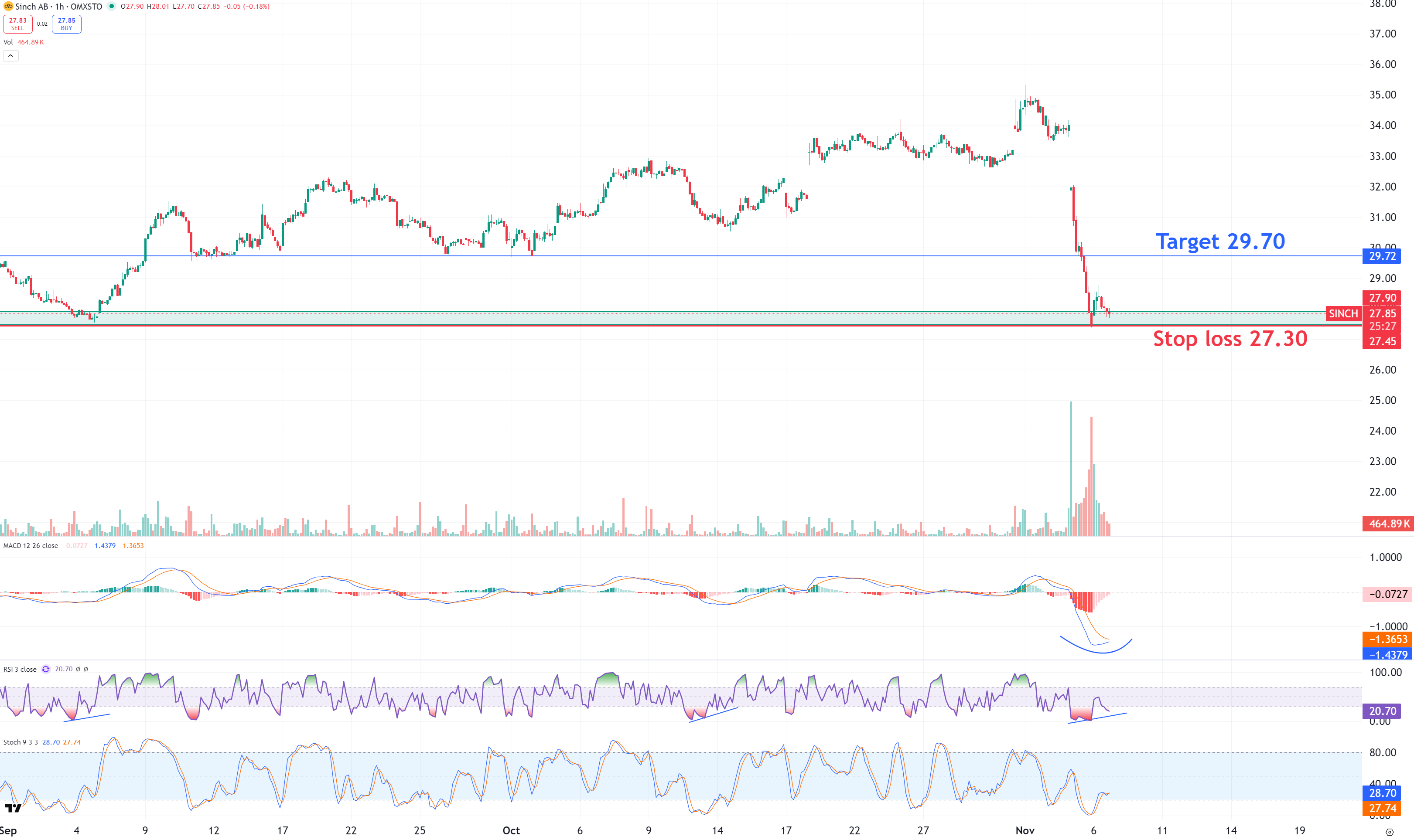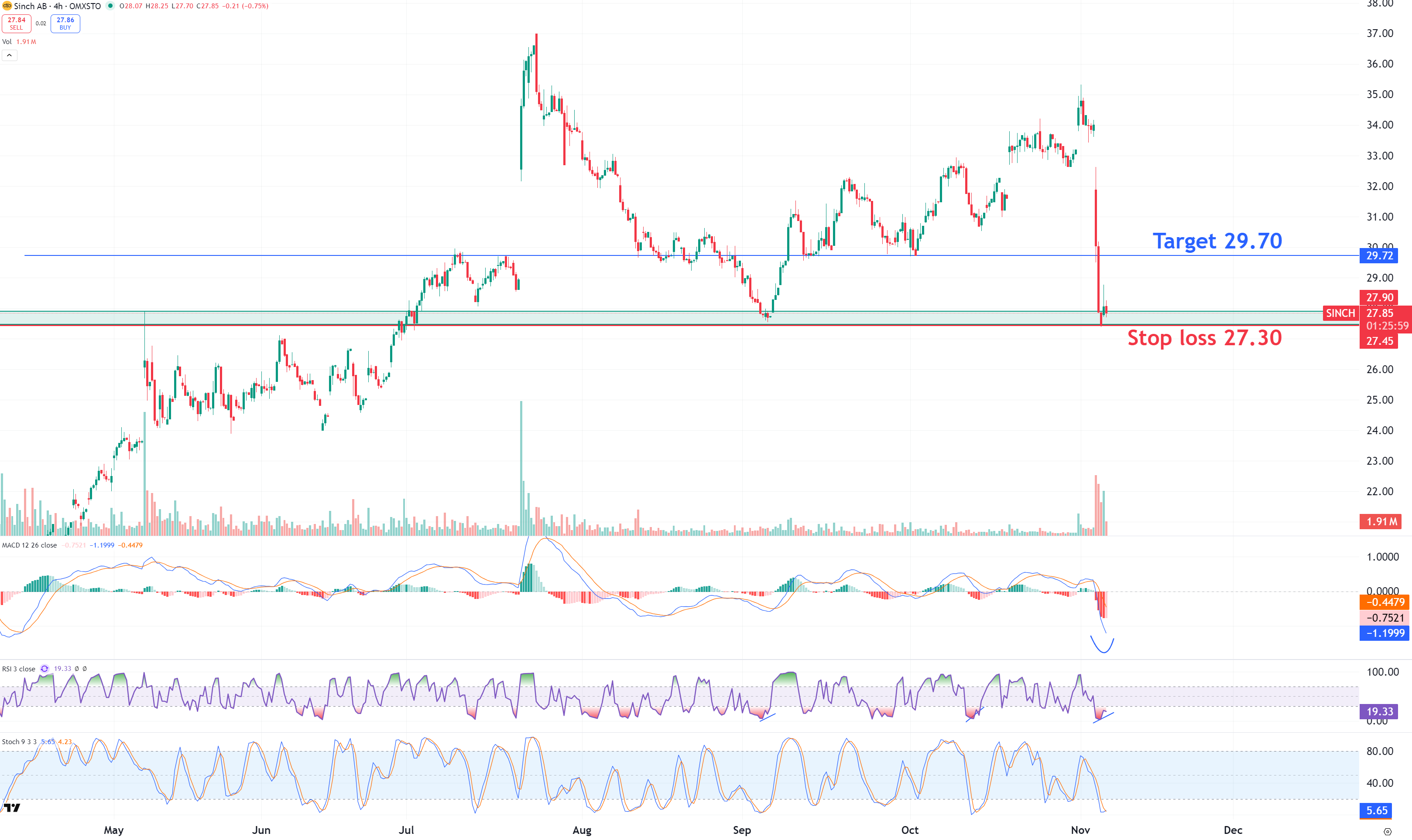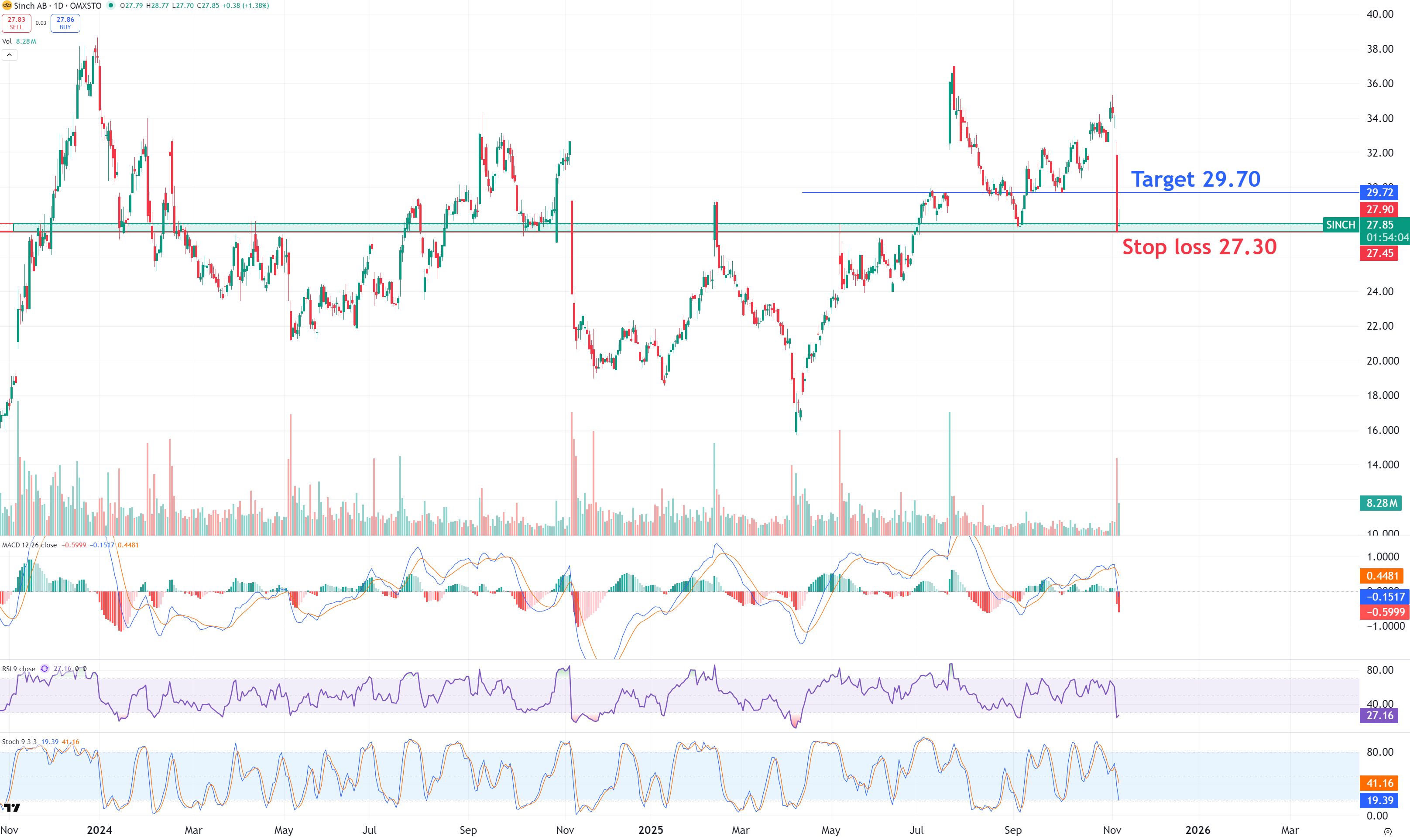 Sinch har ett historiskt stödområde här vid 28.00-27.45kr och var som lägst nere på 27.38kr igår. Vi sätter vår stop loss till 27.30 kr. På uppsidan ser vi återtest av 29.70kr senare i november. Efter gårdagens fall är aktien kraftigt översåld och en studs bör vara befogad.