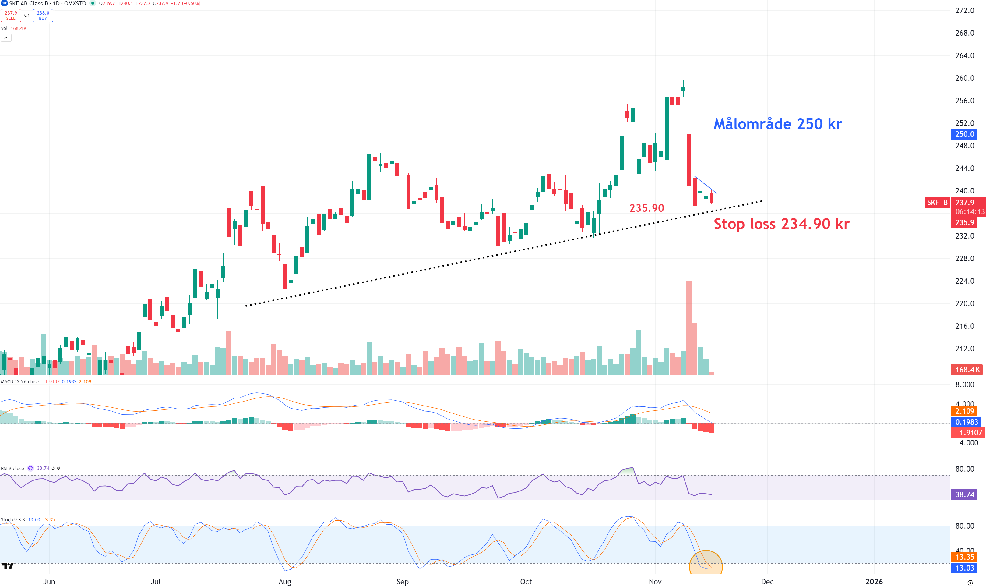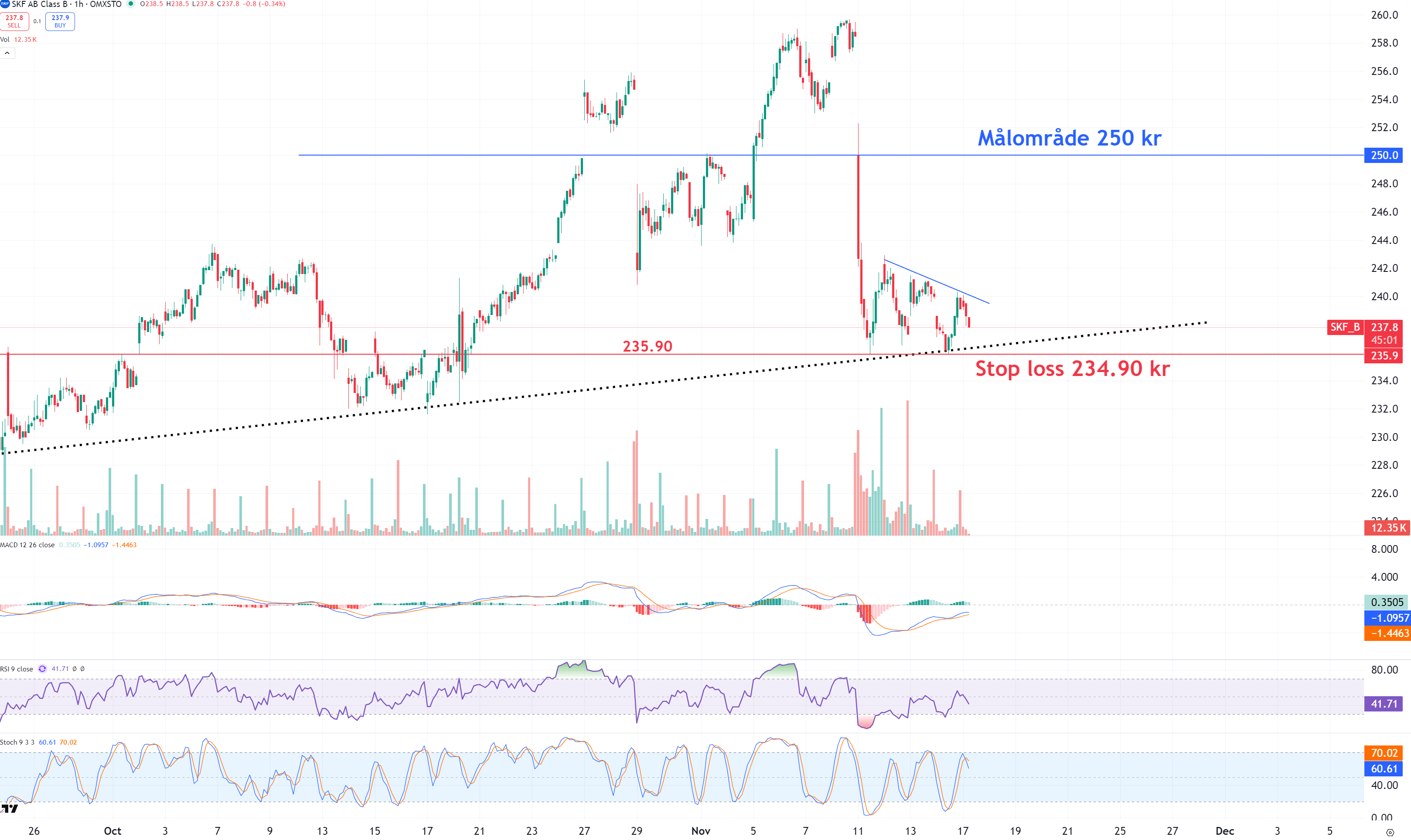 SKF är nu ner -8% efter förra veckans kapitalmarknadsdag som visade på högre kostnader än väntat för separationen av fordonsverksamheten (5 mdr sek). Det bör nu ligga i kursen och de senaste handelssessionerna har aktien funnit stöd på 235.90 kr. Vi väljer att gå lång här med en stop loss 1 krona under det stödet på 234,90 kr. På uppsidan ser vi återtest av 250 kr senare i november. Det ger en underliggande risk på -1,30 % i aktien och en potential på +5,05 %.