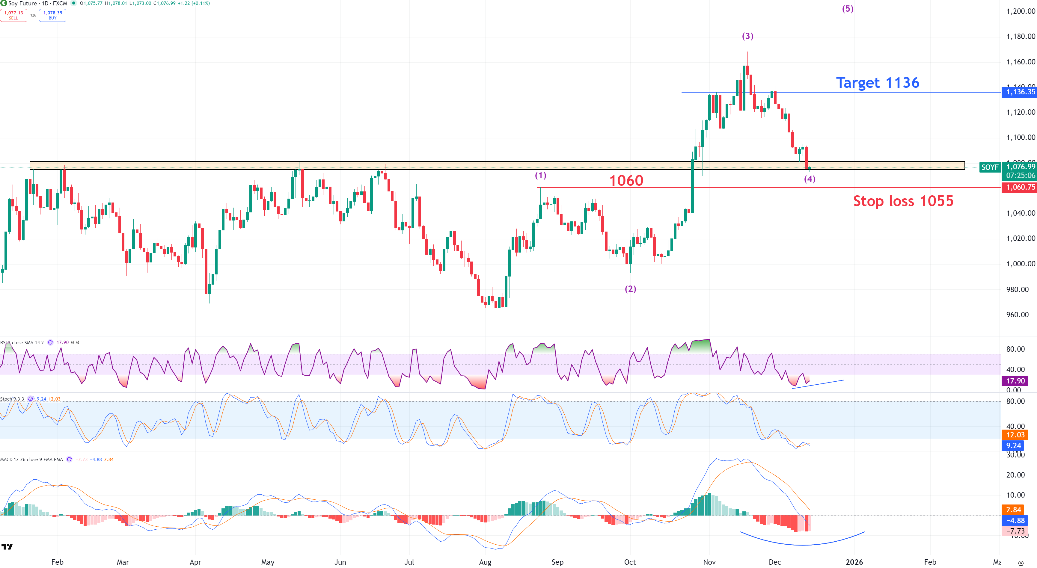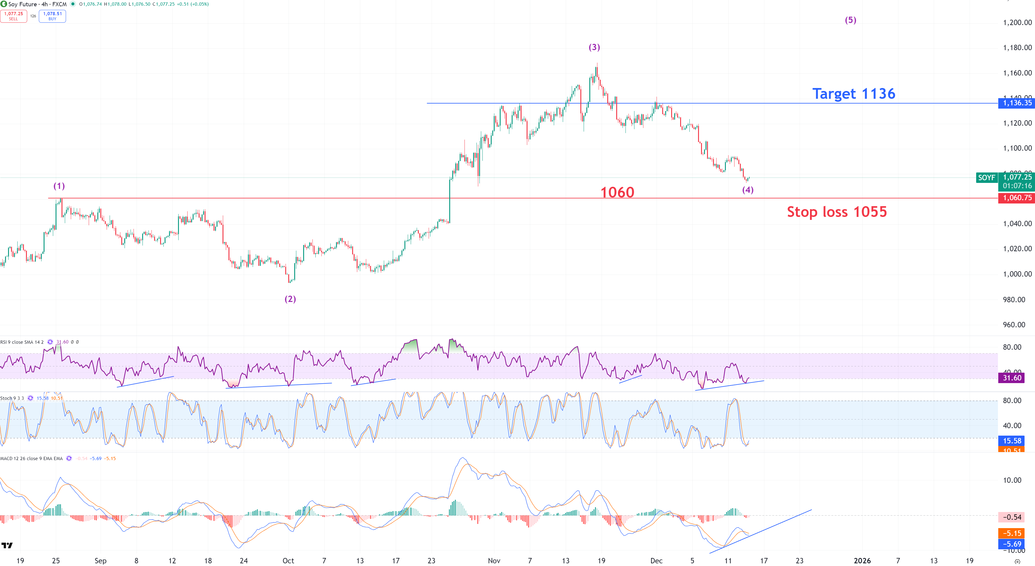 Som alltid letar vi efter tillgångar som vi anser uppvisar bra risk/reward innan vi tar position. Idag gör Sojabönor debut i affärscasen där vi anser att en uppgång bör stå för dörren. Vi laborerar rörelsen från toppen den 25 aug som en 5-vågssekvens där nu priset (om den synen är rätt) noteras i slutfasen av rekylen i Våg 4. Det gör att en större våg 5 bör inledas inom kort. Se grafer nedan för bättre förståelse.