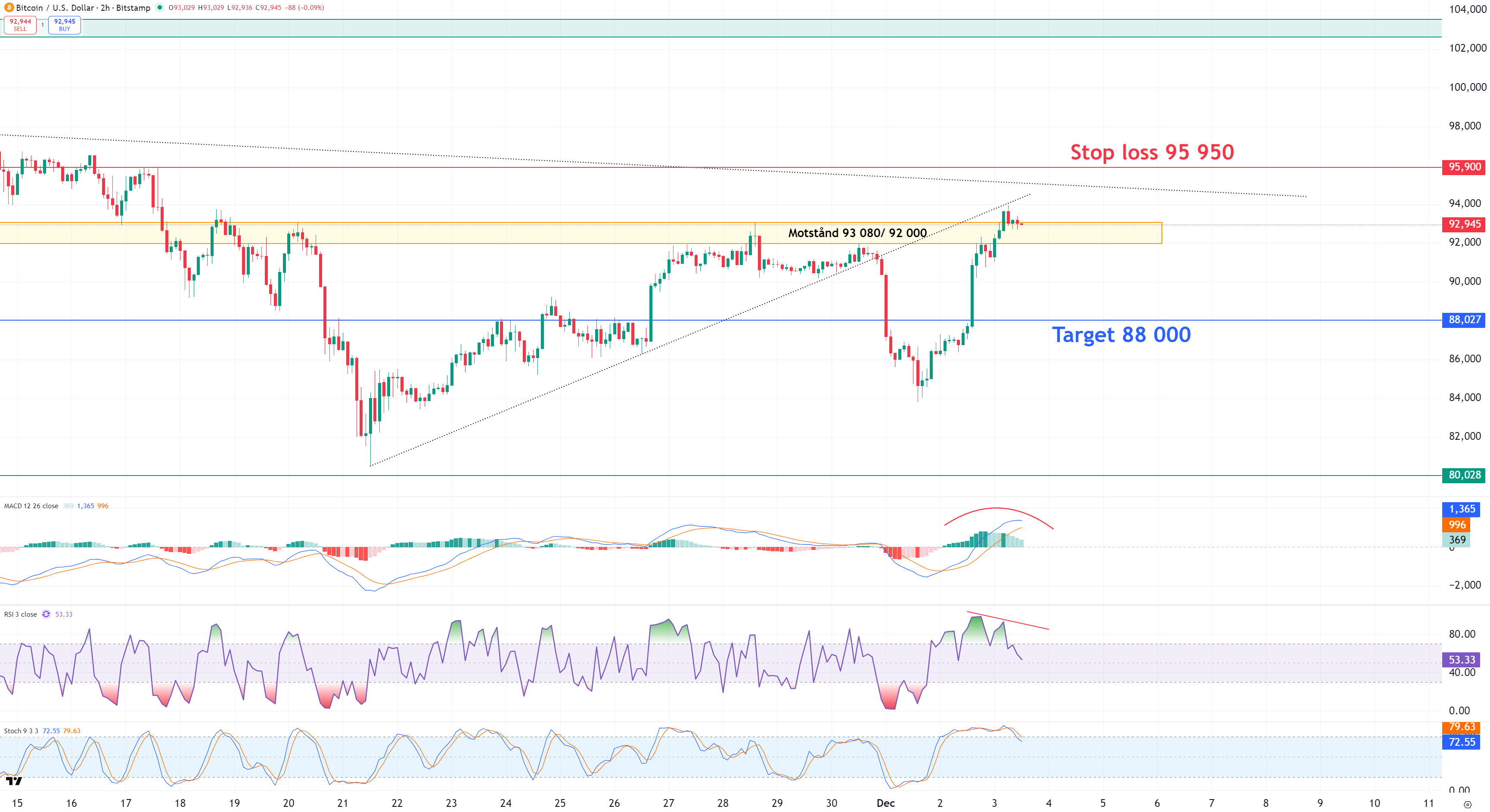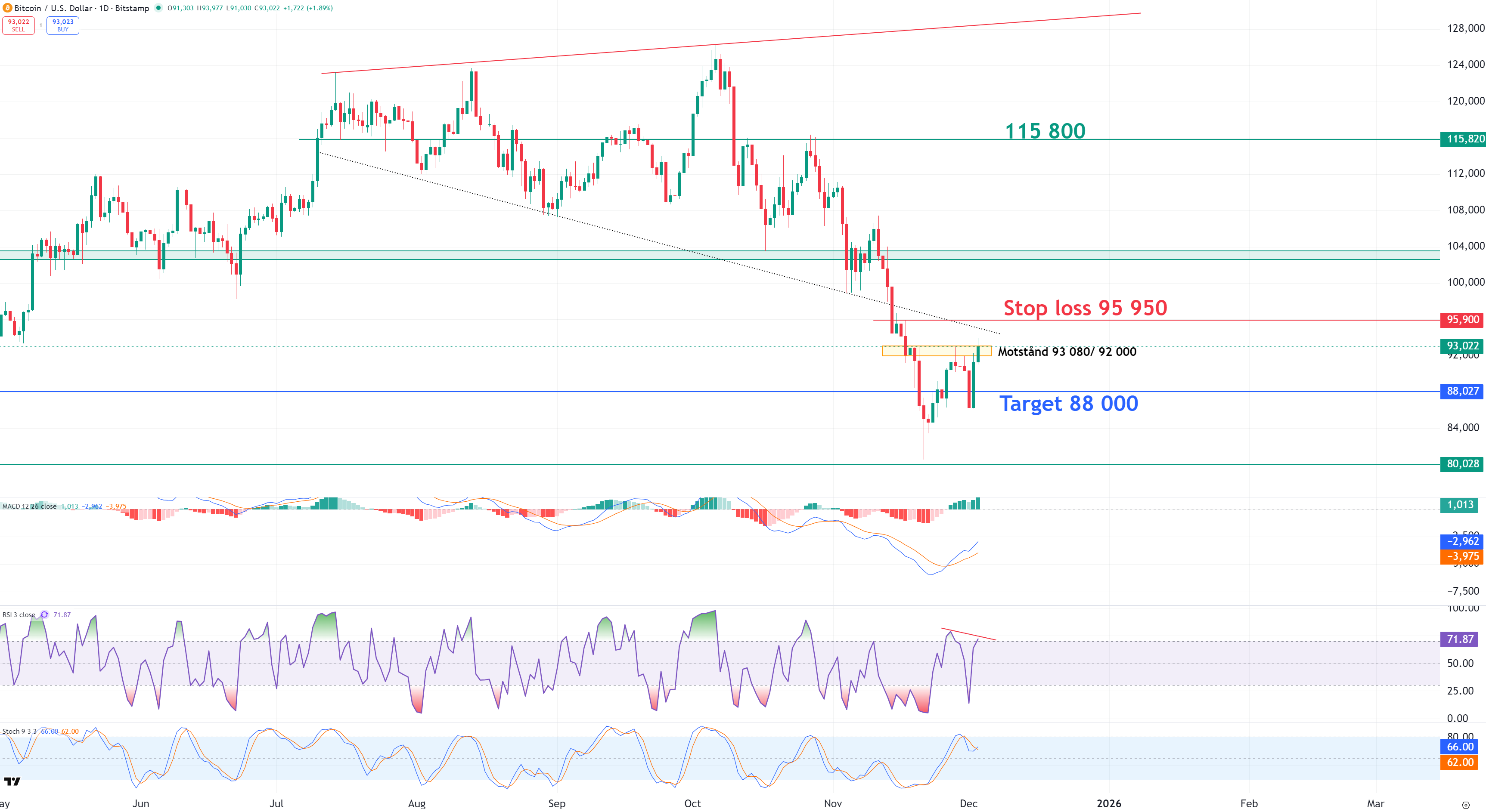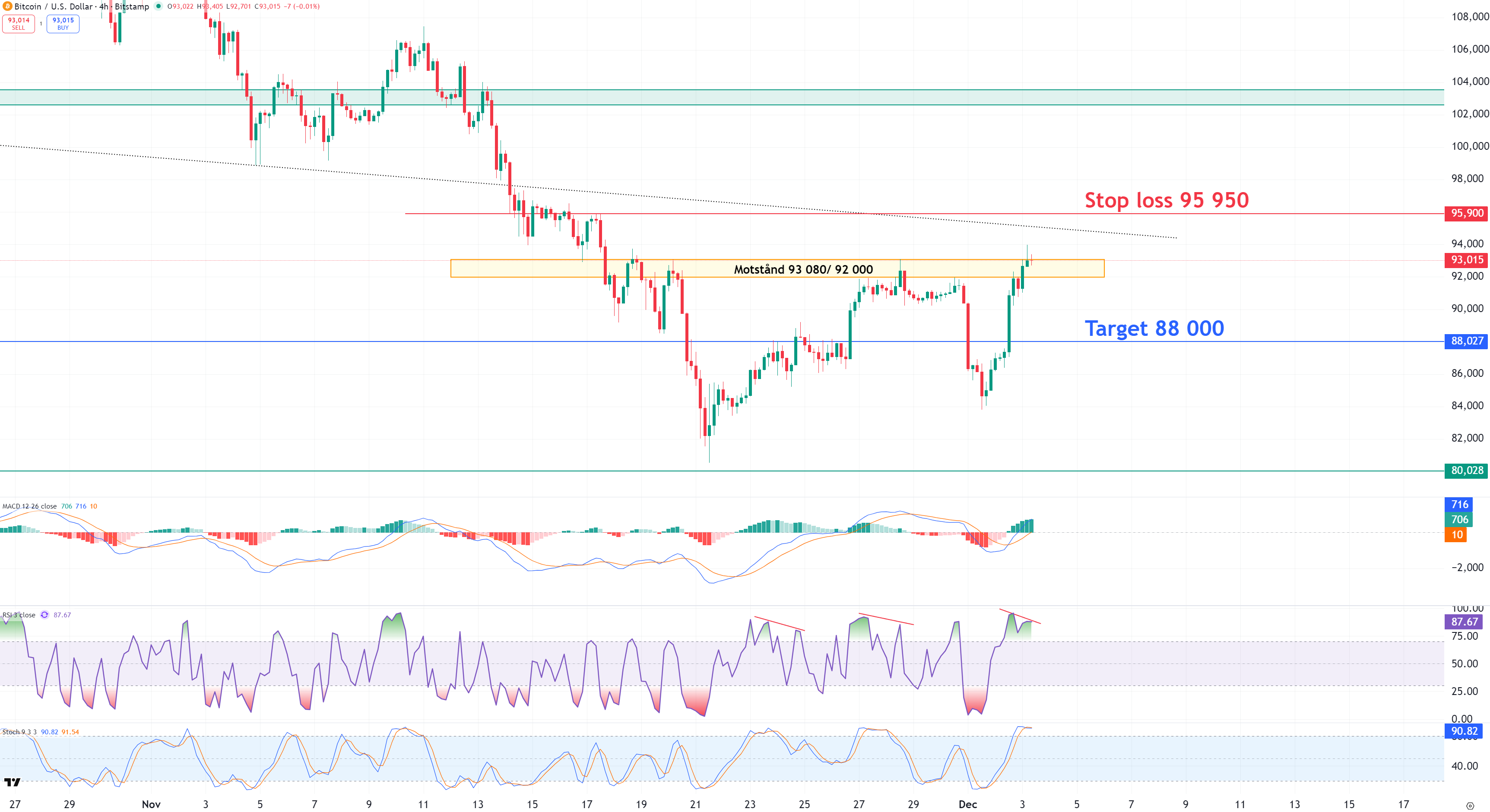 Kortsiktigt har Bitcoin ett motståndsområde här vid 93 080-92 000 USD och är överköpt på lägre tidsintervaller. Vi ser potential för en rekyl ner mot 88 000 usd, vilket också är vårt målområde (+5,35 %). Som alltid använder vi oss av stop losser och denna sätts till motsvarande 95 950 (-3,20 %).