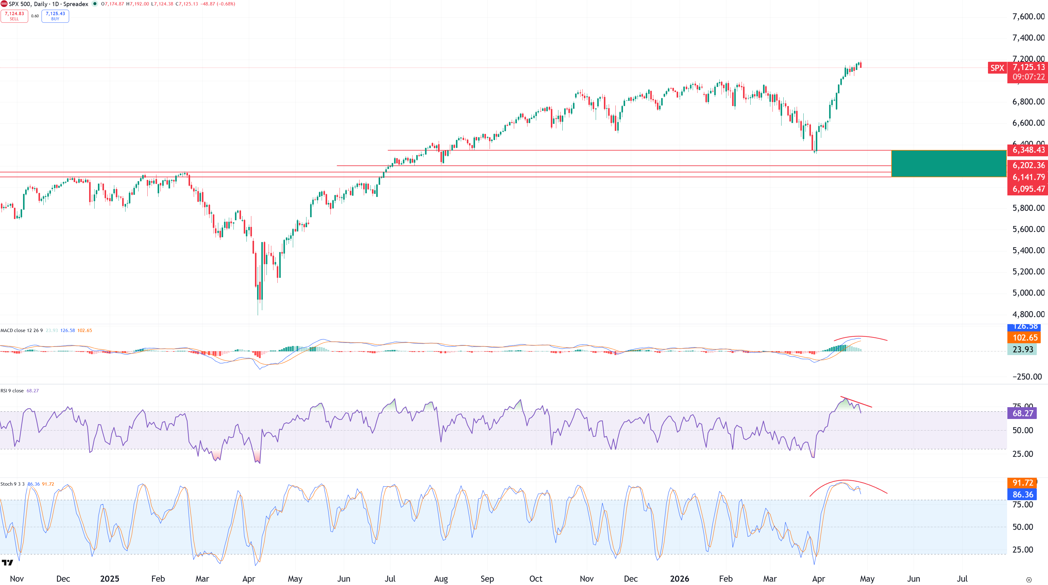 Graf: S&P 500 med negativa divergenser i RSI.