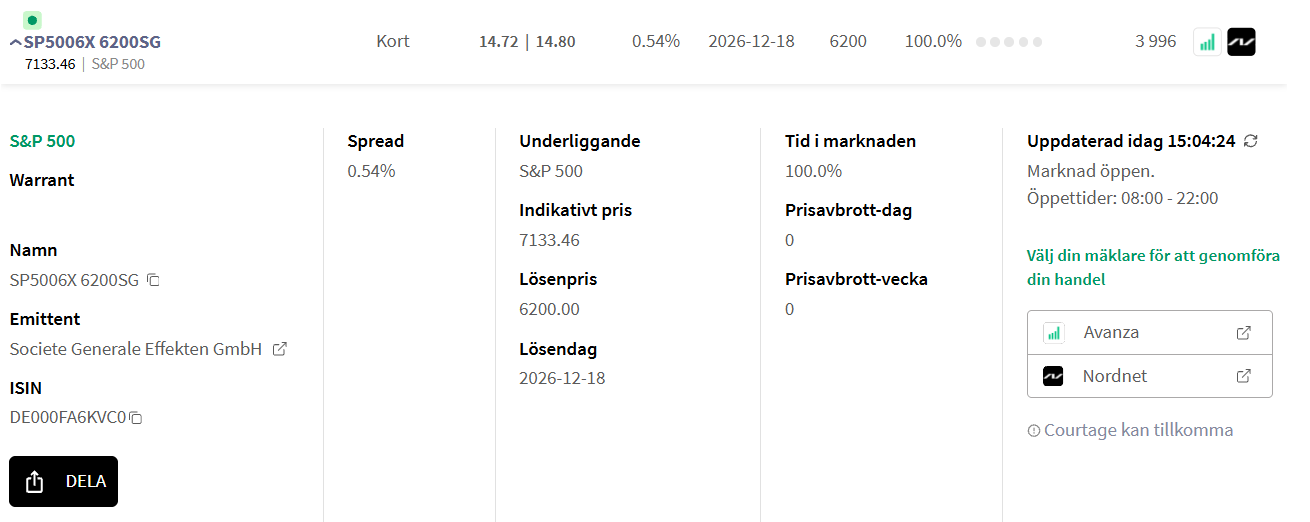 SP5006X 6200SG är en säljwarrant på S&P 500 från Société Générale med lösendatum den 18 december och lösenpris 6200 punkter. Denna kostar nu 14,80 kr enligt bilden nedan från Warrantlistan på Marketmate.