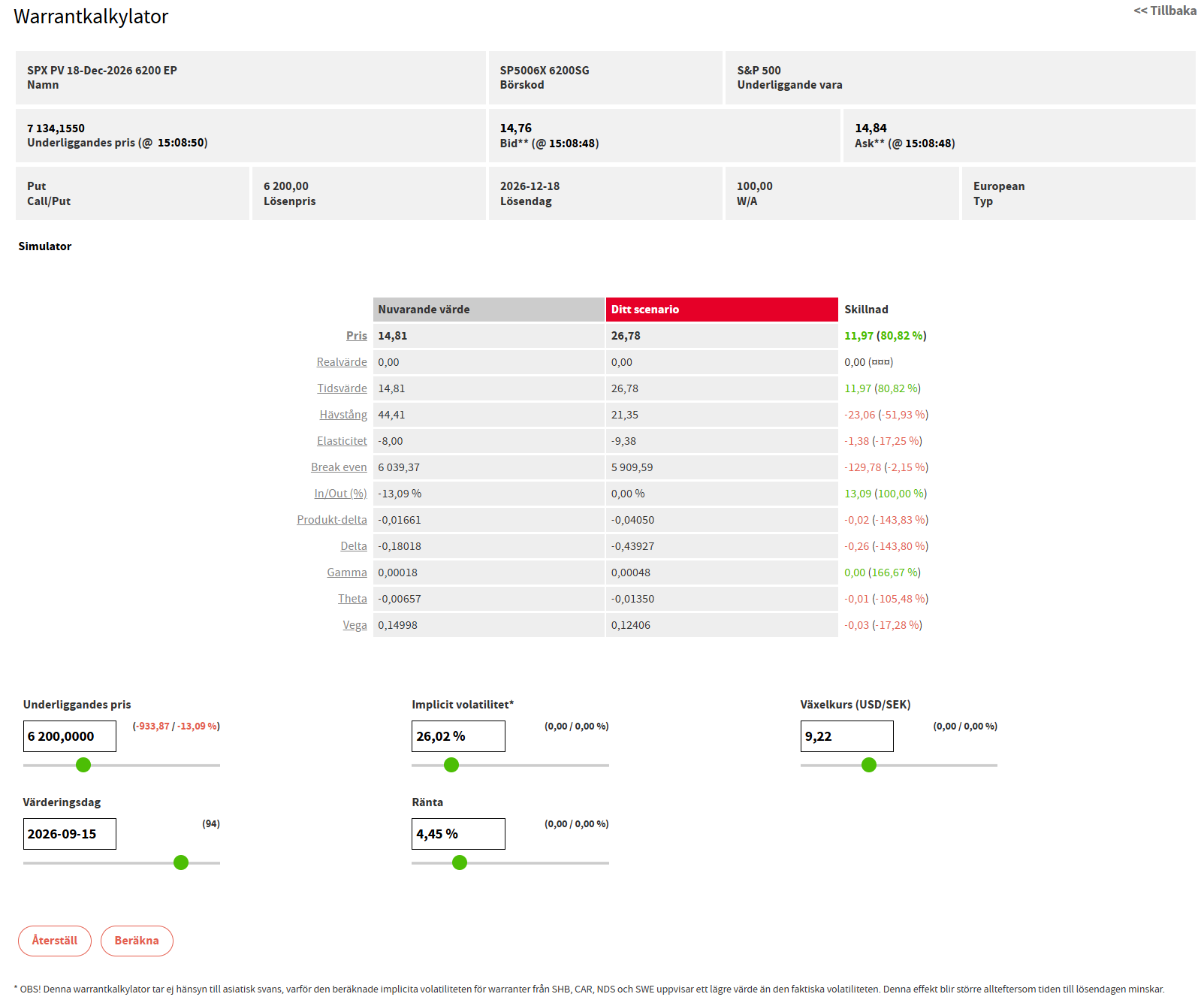 Vi vänder oss som vanligt till Warrantkalkylatorn för att göra estimat av olika utfall och dess påverkan i pris på warranten. Här kopieras warrantens börskod in: SP5006X 6200SG. Vi utgår från exemplet i denna artikel med en skarp rekyl in i september och laborerar med att S&P 500 når 6200 punkter i mitten av september (15 sept). Här ändrar vi “Underliggande pris” till 6200 och “värderingsdag” till 2026-09-15. Resterande fält så som implicit volatilitet, ränta och växelkurs lämnas oförändrade för att visa på en mer “clean” bild av effekten på en nedgång i index. Det ska dock tilläggas att i en större nedgång bör volatiliteten öka på nytt och därmed påverka priset på denna warrant positivt eftersom volatilitet är en del av prissättningen av derivat som detta.