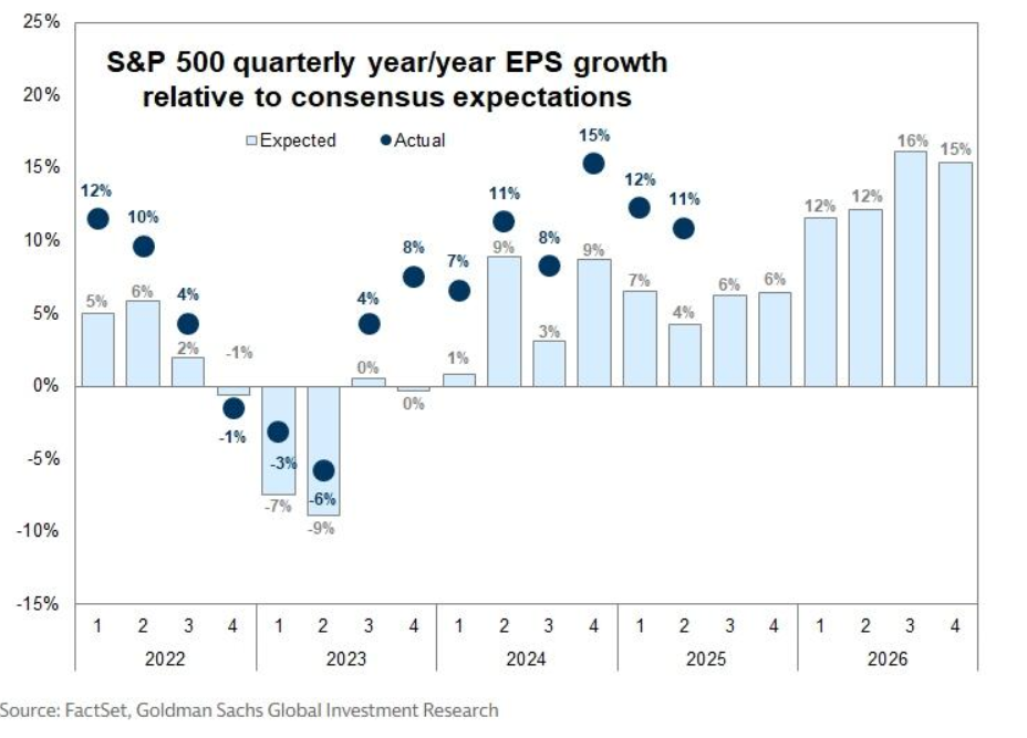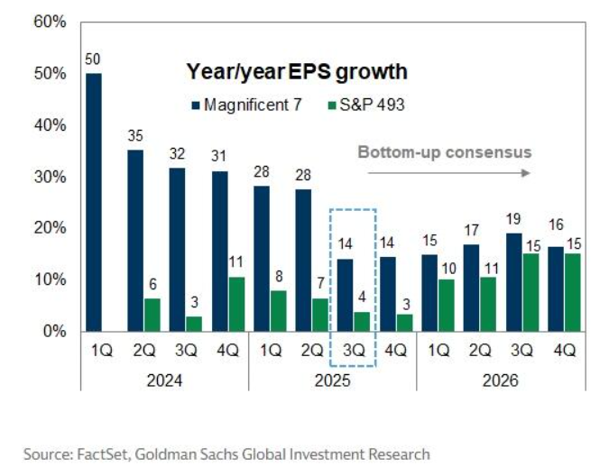 Enligt Goldman Sachs ser förväntningarna på bolagen inom Magnificent Seven speciellt låga ut och dessa borde komma in starkare än väntat för nionde kvartalet i rad. Konsensus förväntar sig en skarp deceleration inom Mag Seven till +14 % EPS-tillväxt i Q3, vilket är strax under hälften mot vinsttillväxten på i snitt +30% de senaste fyra kvartalen. I Q2 såg vi en liknande skepsis från analyskåren, men där sedan bolagen i snitt överträffade vinstprognoserna med +11%!