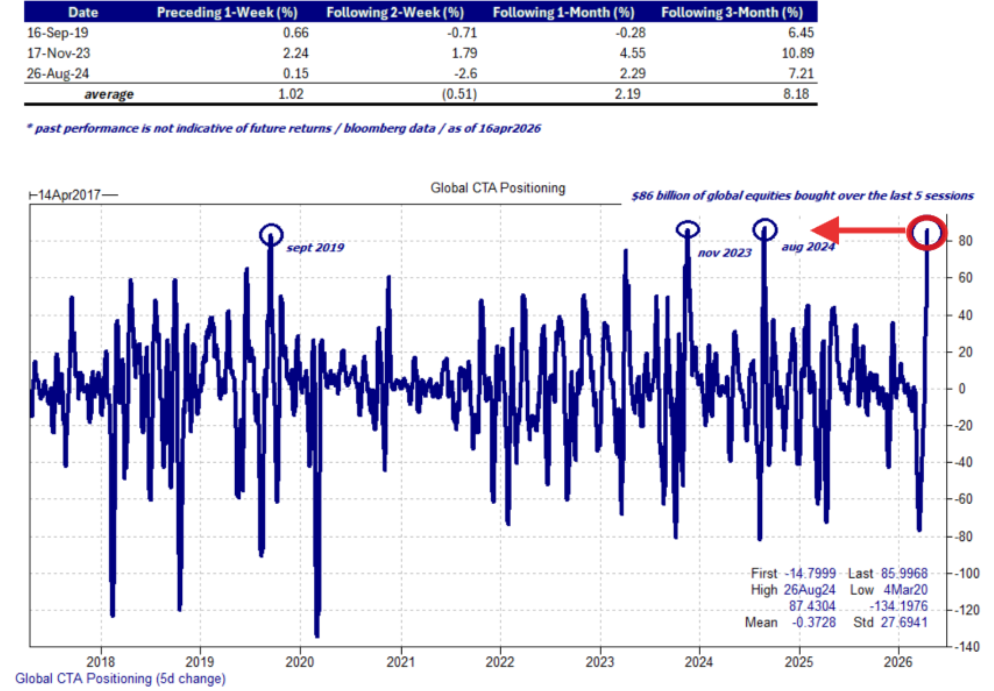 De senaste fem handelsdagarna har globala CT:er köpt aktieexponering för hela +86 mdr USD. Det är bland det högsta köptrycket någonsin sett till den korta tidsperioden! Goldman Sachs flödesmodeller visar nu på att de kommer att behöva köpa för ytterligare +70 mdr USD kommande 5 dagarna, i en stillastående marknad!