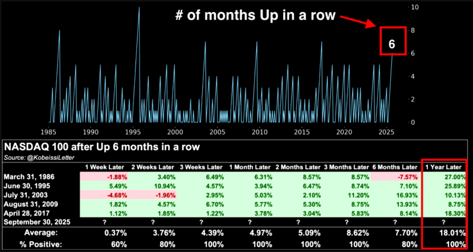 Nasdaq 100 är nu sex månader i rad, vilket är sjätte gången detta inträffar sedan 1986. Vad säger historien om fortsättningen?