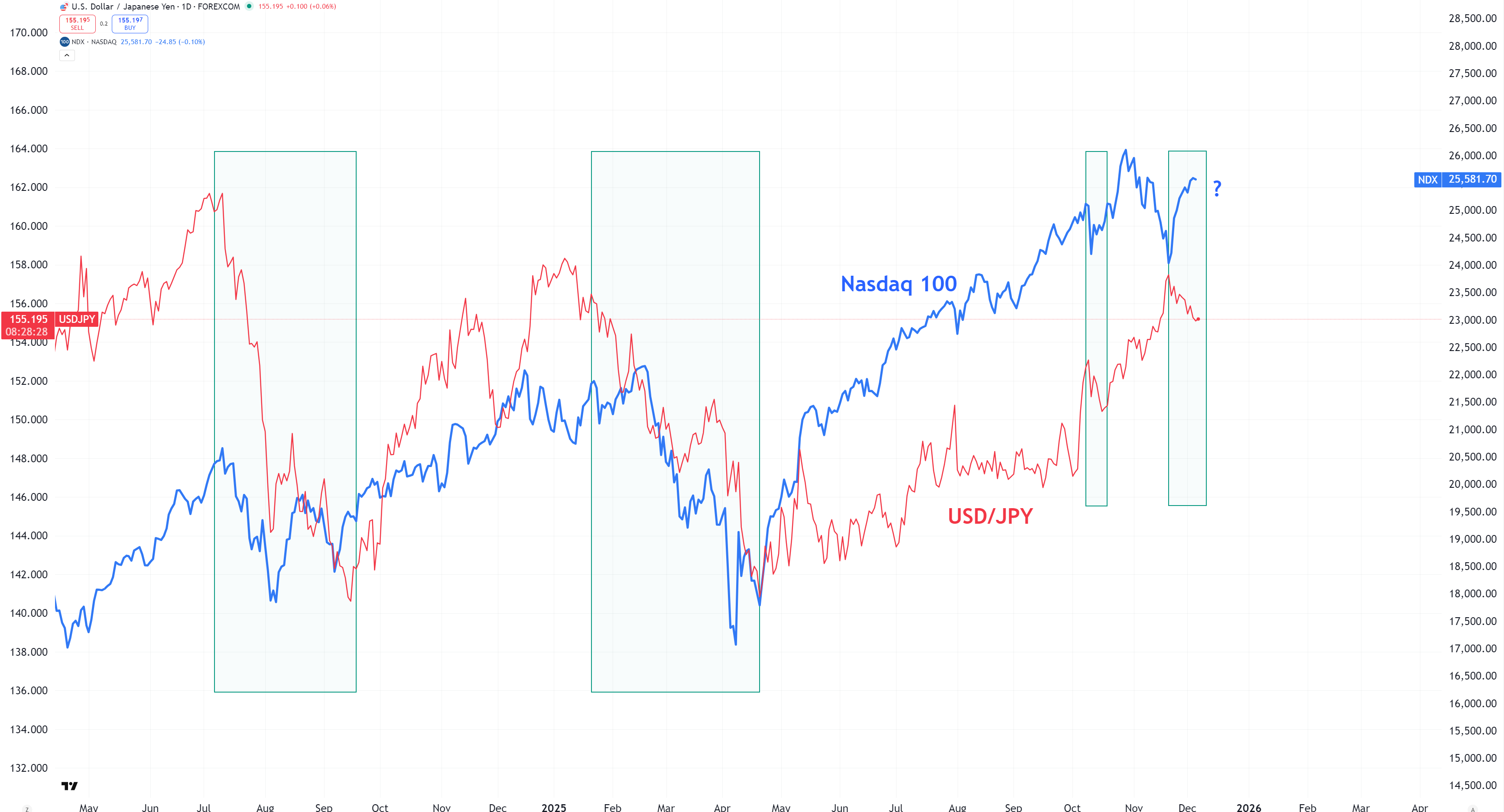 Utvecklingen på Dollar/Yen går ofta hand i hand med utvecklingen på Nasdaq 100 via “carry traden”. Perioder med starkare Yen tenderar att leda till ökad volatilitet och svaghet på Nasdaq. Den senaste bouncen på Nasdaq har präglats av just en förnyad styrka i yenen. Något att fundera på…