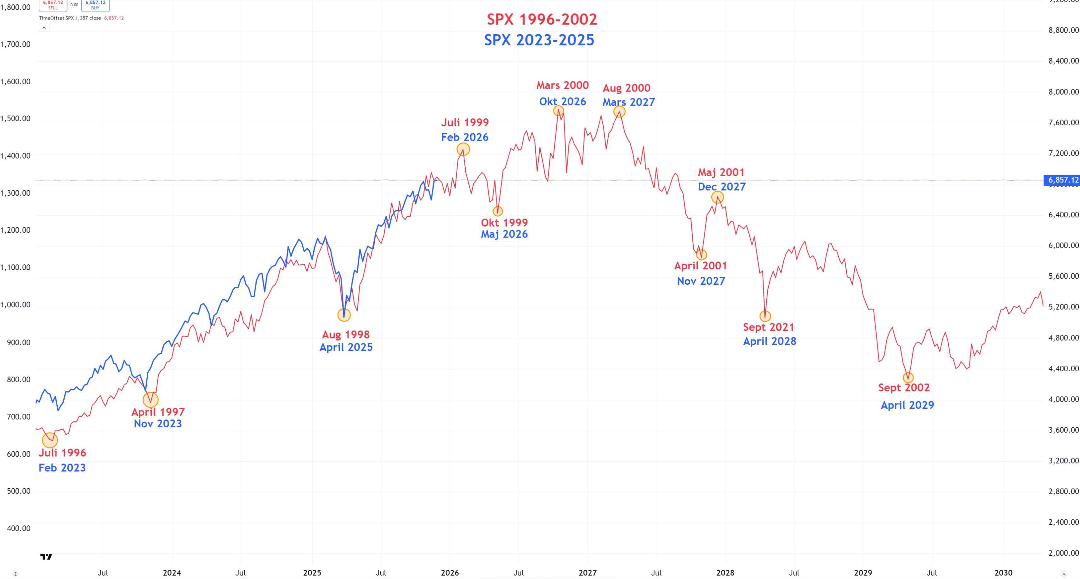 Som avslutande kuriosa valde jag att jämföra utvecklingen på S&P 500 från början av 2023 med utvecklingen från mitten av 1996. Hittills ser vi en hög korrelation rent rörelsemässigt mellan de båda tidsperioderna och både botten i oktober 2023 och april 2025 återfinns i utvecklingen under 1997. Ska utvecklingen från 1999-2000 fortsätta att spela ut, trots att PE-talen inte alls är att likna med IT-bubblan, så bör kommande 16 månaderna komma att utgöras av ett otroligt stort och volatilt toppbygge med slag på +/-15% och en absolut topp i Q1 2027. “History doesn’t repeat itself but it rhymes…?”