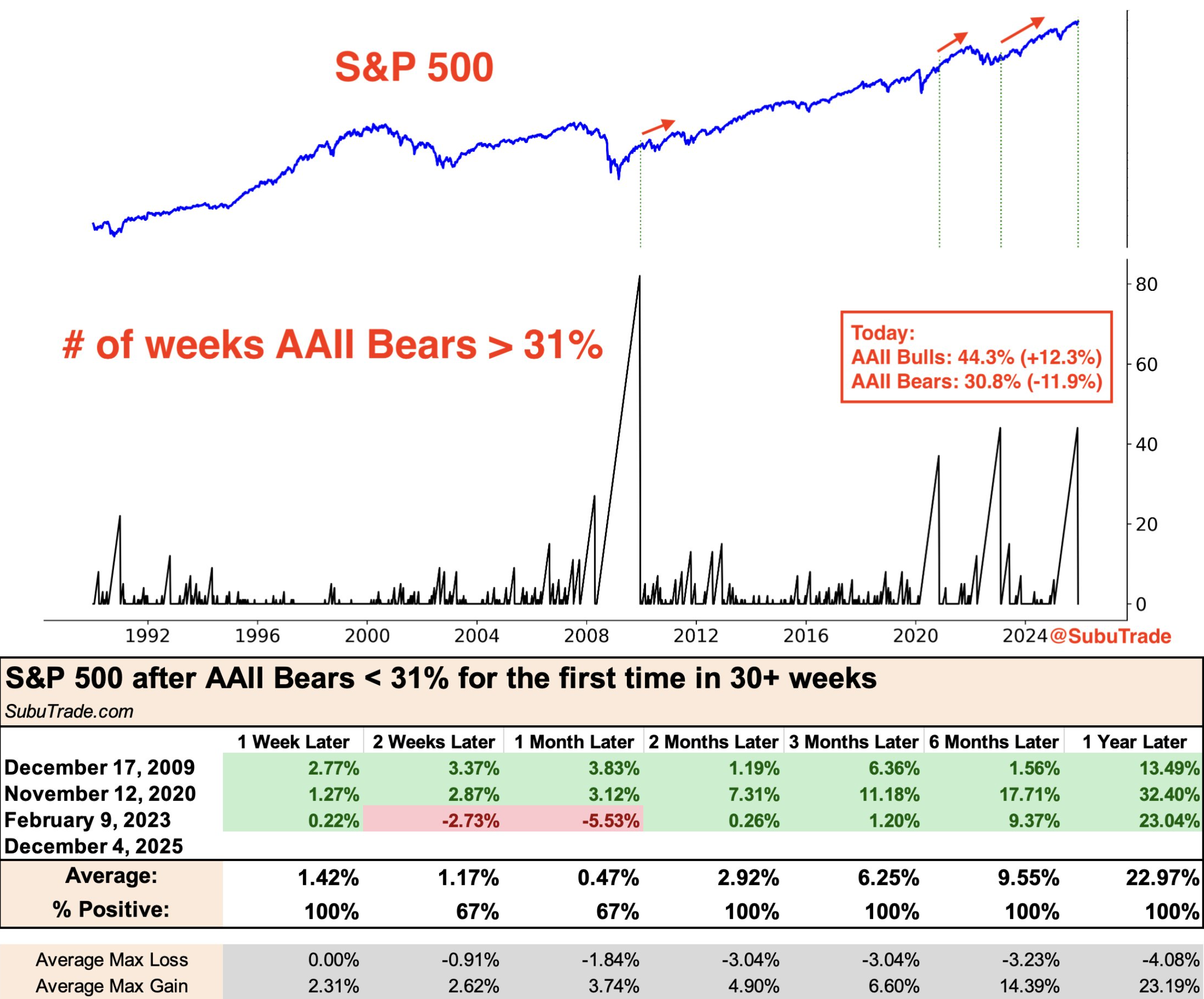 Faktum är att just Bears kapitulerar är en bra signal historiskt. I över 40 veckor i rad har andelen Bears noterats på över 31% för att denna vecka falla ner strax där under till 30,8%. Urvalet av data är skralt och endast tre gånger sedan 2009 ger ingen statistisk signifikans, men historiskt har framförallt 2 månader och däröver bjudit på stabila uppgångar.