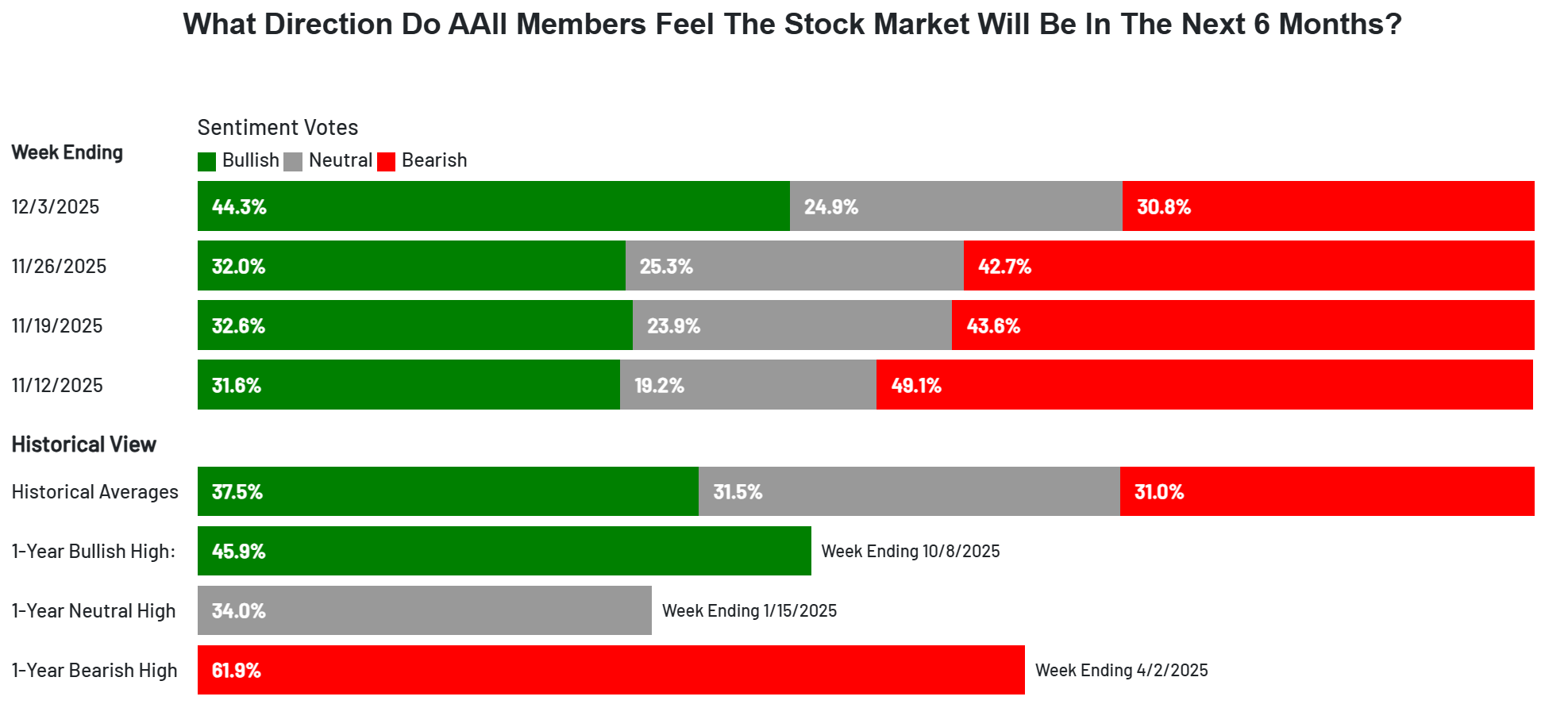 AAII Sentiment Survey denna vecka visar på en kraftig ökning av andelen Bulls, medan andelen Bearish imploderat till 30,8 % från höga 49,1% den andra veckan i november. Frågan dessa investerare får svara på varje vecka är “Vad tror du om S&P 500 på 6 månaders sikt, Upp, Ner eller Neutral? Nu efter uppgångar på +6-10% på den amerikanska indexen är det många som ser ljuset i tunneln från november.