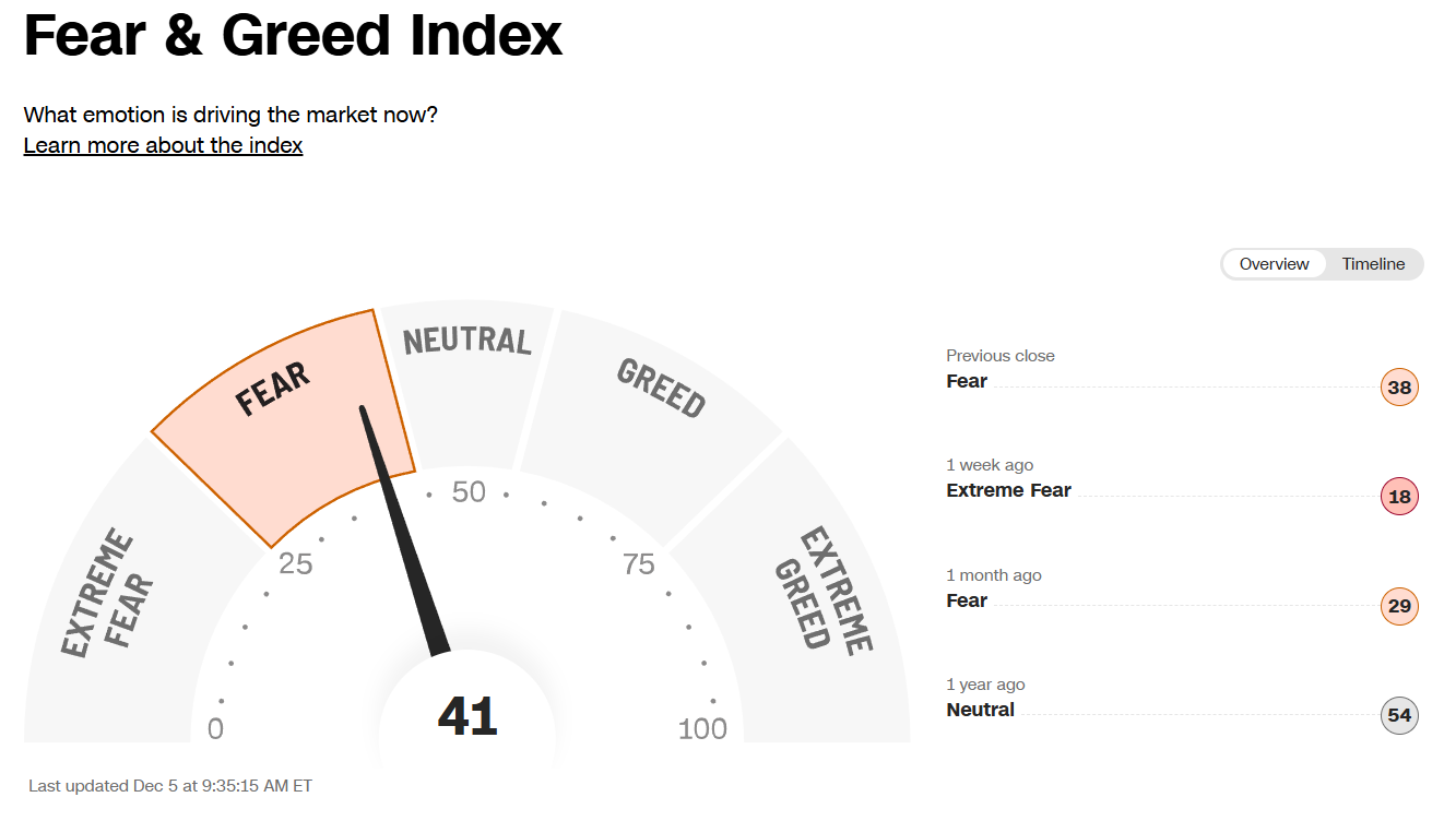 Vid botten 21 november noterades CNNs Fear & Greed Index på extremt låga 6 av 100. Nu på betydligt mindre extrema 41 av 100.