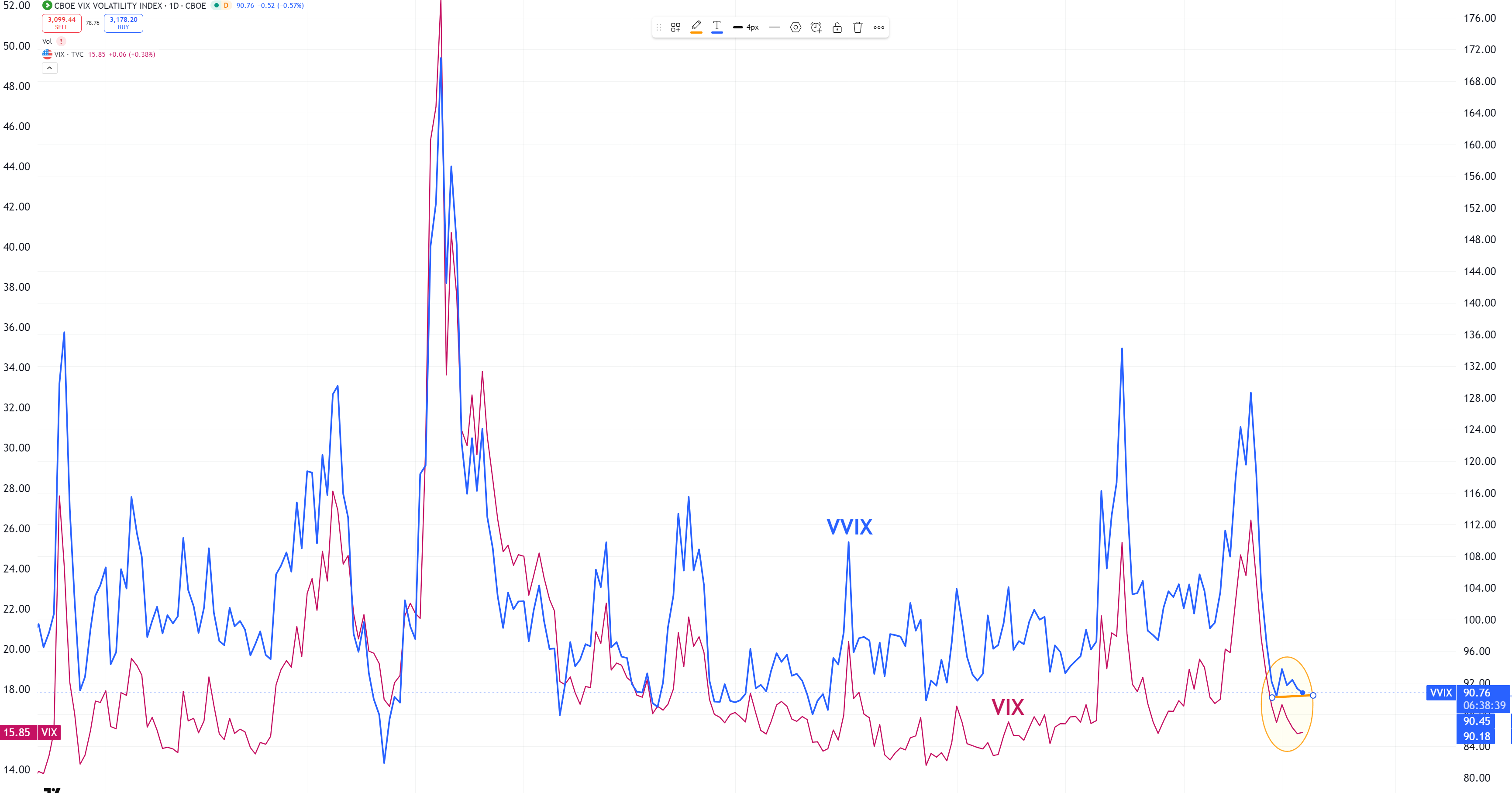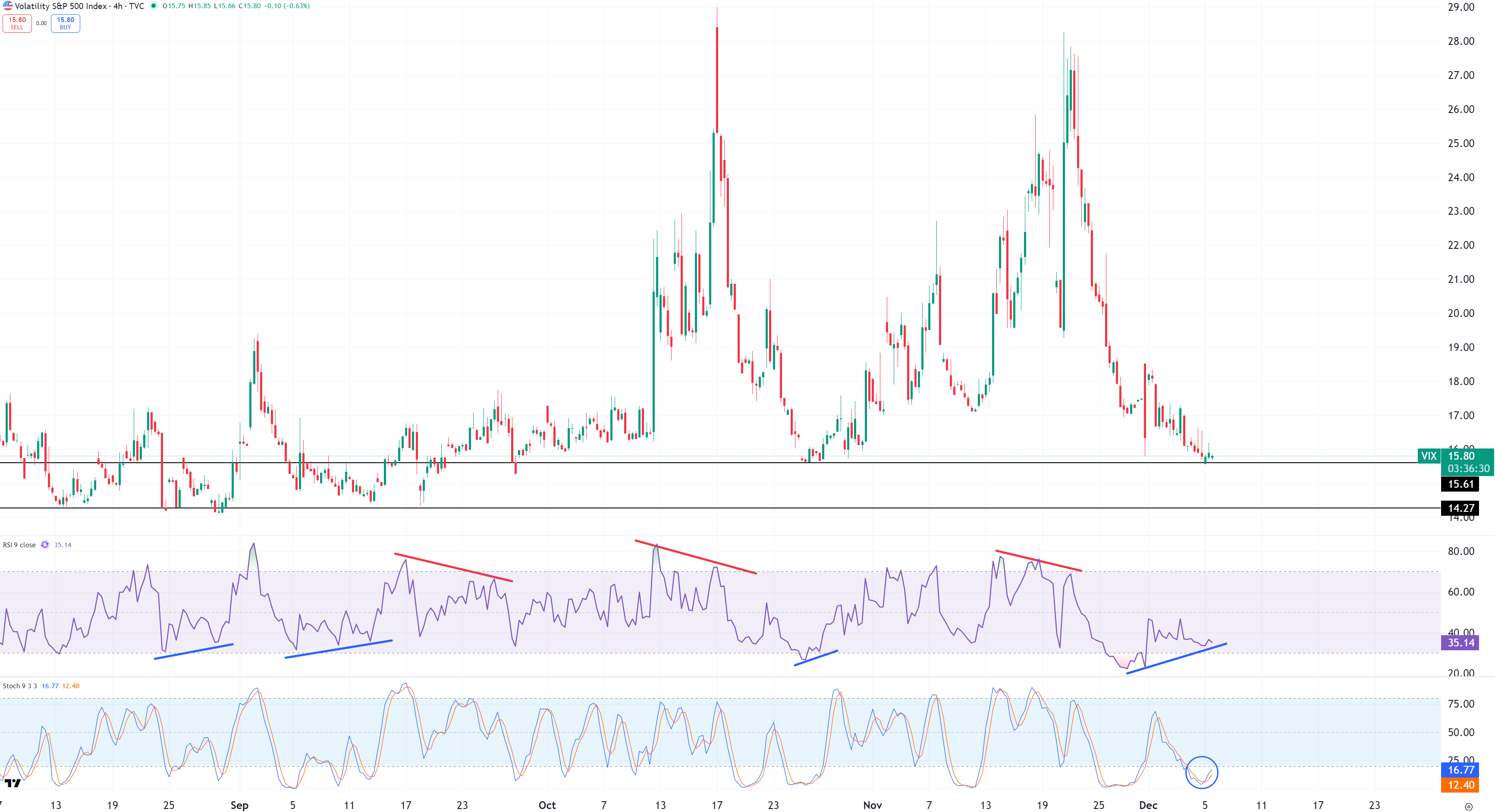 Divergensen mellan VVIX och VIX samspelar också med en tydlig positiv divergens RSI(9) i VIX-index här. Upplösningen i grafen är 4 timmar.