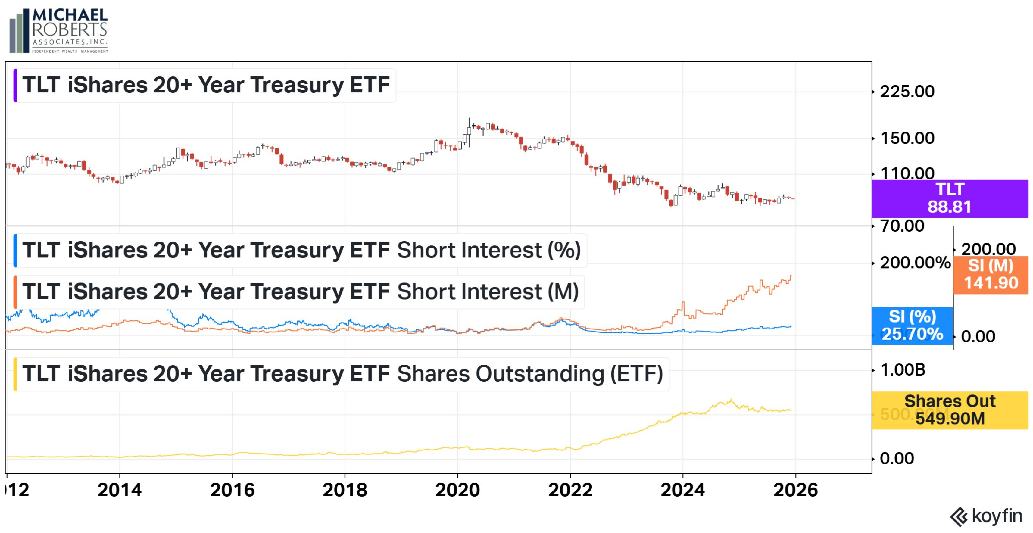 Blankningarna noteras nu på 25,7 % i TLT ETFen (20y+ obligationer i USA). Räntehandlarna räknar därmed med högre långräntor framöver.