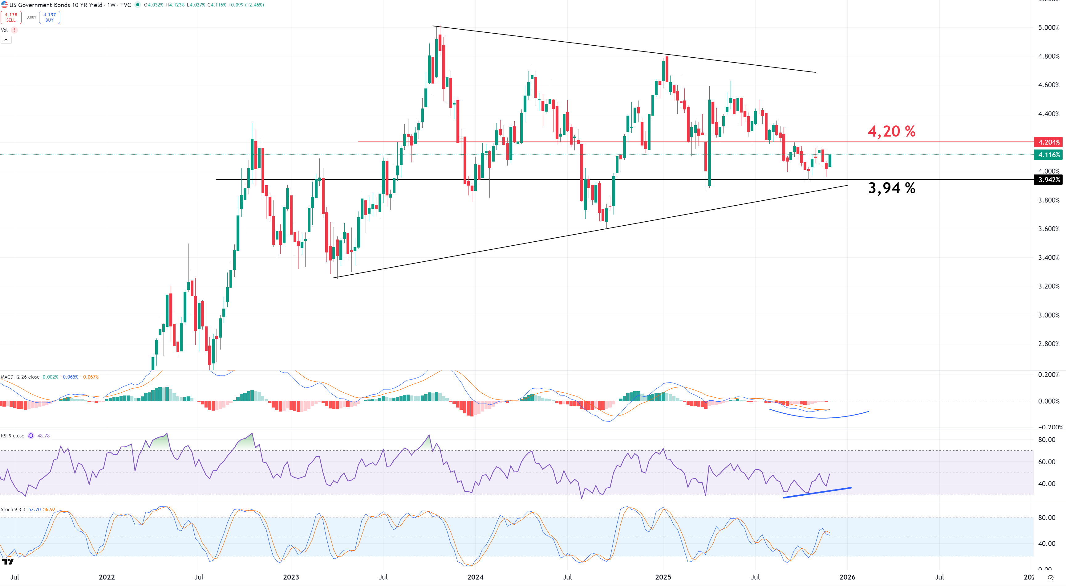 Amerikanska 10-åringen handlas i ett intervall på 3,94-4,20%. Bevaka eventuellt utbrott på Fed på onsdag!