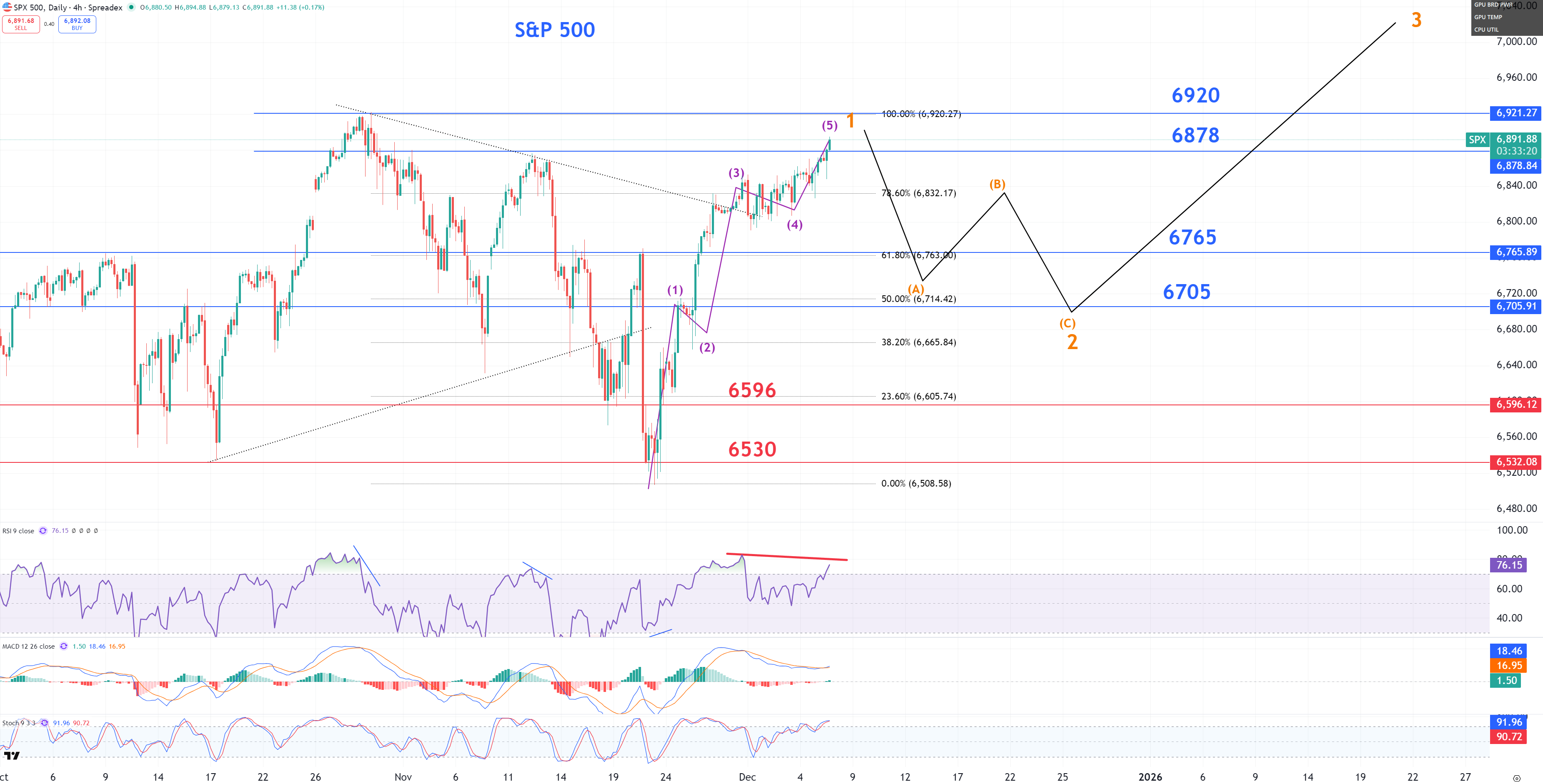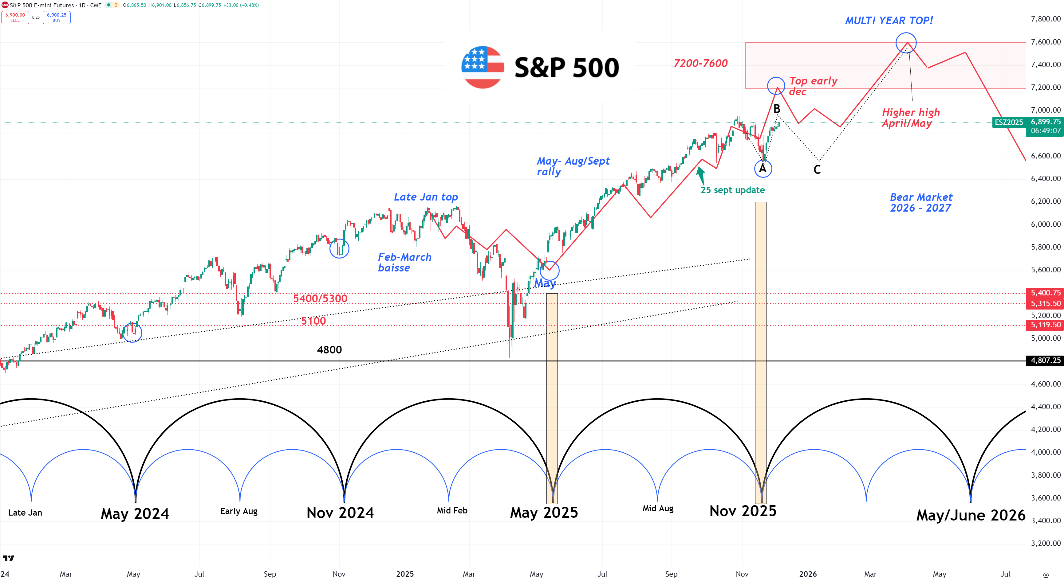 Generellt sett räknar vi fortfarande med en lokal topp här i krokarna rent tidsmässigt inför en förnyad rekyl mot mitten/slutet av december. Mer om vårt tänk på kort sikt (1-3 veckor) i den in zoomade grafen på S&P 500 längre ner i veckans utskick. Det fina med uppgången som vi sett sedan botten den 21 november är att den har varit stark och bred! Det gör att en rekyl i december troligtvis inte sätter några nya bottnar jämfört med november och lämnar en bra språngbräda upp mot våren där vi fortfarande ser 7600 som målområde på S&P 500. Således ska botten “Våg C” i grafen nedan som skrevs in 21 november flyttas upp en aning. Våg B har för övrigt spelat ut helt enligt plan de senaste två veckorna, med potentiell viss uppsida kvar in i början av nästa vecka.