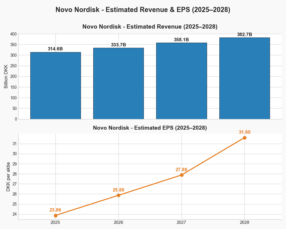 Prognoserna för framtiden ser också riktigt bra ut, vi ser en långsammare ökning i omsättning men detta är väntat med tanke på den nya konkurrensen från Eli Lilly. Även den enorma utvecklingen som företaget gått igenom de senaste åren. Estimaten för EPS (vinst per aktie) fram tills 2028 ser oerhört stabil ut. Men vi får inte glömma bort att det är omöjligt att räkna med oväntade händelser i dessa prognoser. Hälsovårdsbolag kan ofta råka ut för dessa.