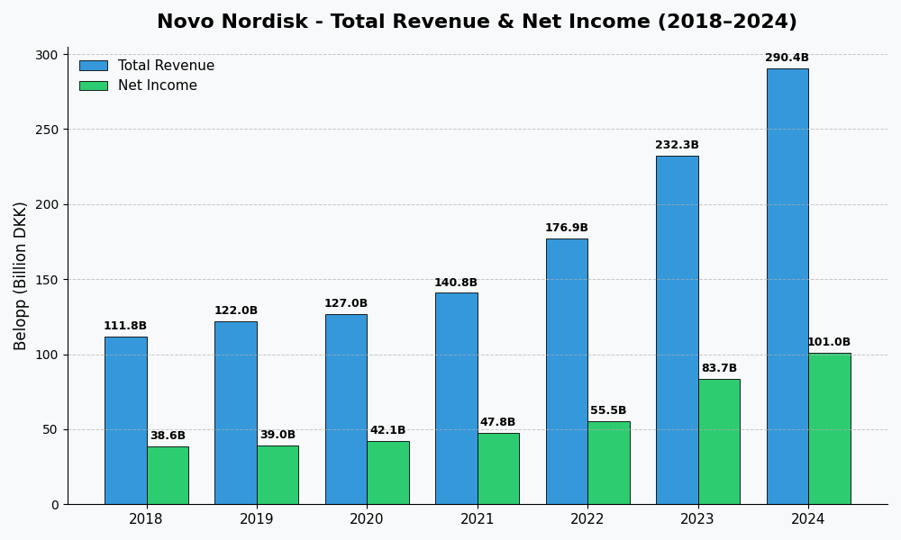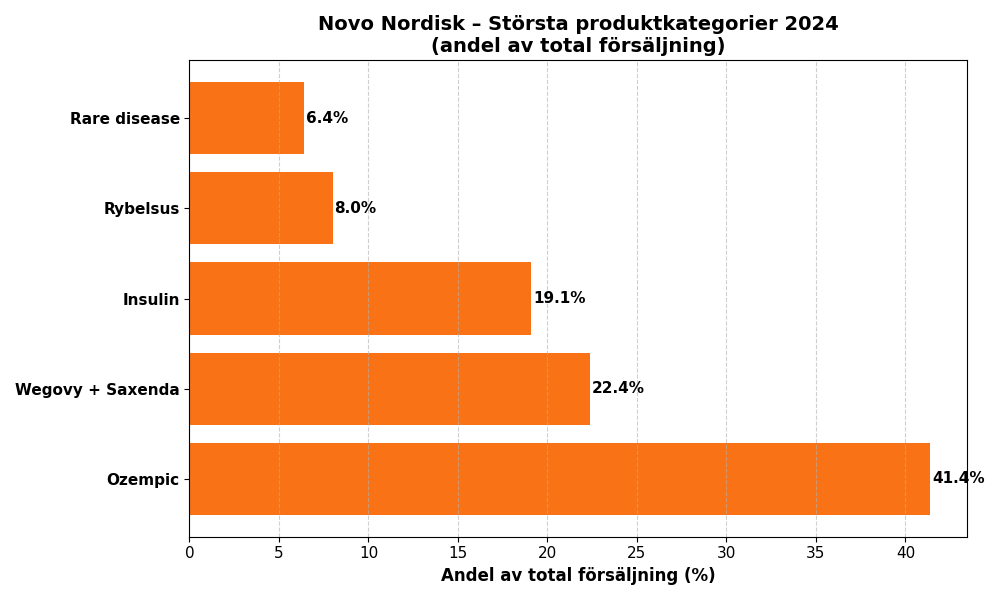 Därför kom Novo Nordisk ut med medicinen Wegovy några år efter Ozempic, samma substans (högre dos Semaglutid) och särskilt framtagen för viktminskning. Studier under 2023 visar även på hjärt- och kärlfördelar vid användning. Dessa två i kombination gjorde att Novo Nordisk fick ett internationellt rykte som ett revolutionerande hälsovårdsbolag. Här är en bild på total försäljning per produkt under 2024, diagram med data från TradingView.