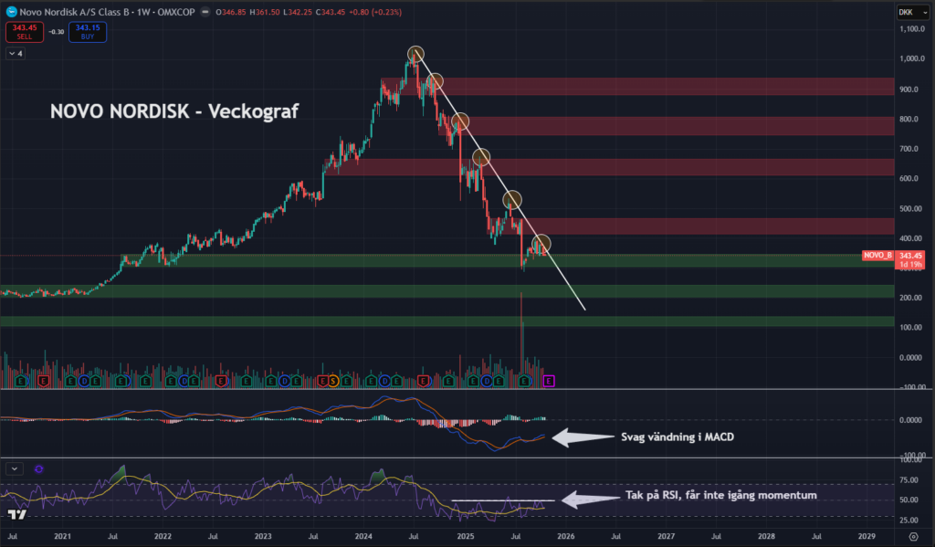 Novo Nordisk är ett fantastiskt läkemedelsbolag med ännu större potential, fallet sedan juli 2024 har haft många olika orsaker som det fortfarande spekuleras kring. Några av dem kommer vi få svar på redan om ett par dagar, den 5 november så släpps Q3-rapporten. Oavsett vad den rapporten säger så är känslan att bättre tider väntar för bolaget på sikt. Trots osämja i bolaget mellan styrelse, vd och ägare är den ekonomiska grunden fortfarande stabil. Novo Nordisk måste hitta tillbaka till sina grundprinciper och börja samarbeta som under den kraftigaste tillväxtperioden 2021-2023. Lyckas de med detta så finns alla möjligheter för en sensationell comeback. Men vi får inte glömma bort att läkemedelsbranschen är tuff och ibland hänsynslös, fällor finns alltid gillrade och Novo Nordisk måste ta rätt steg för att hamna på banan igen.