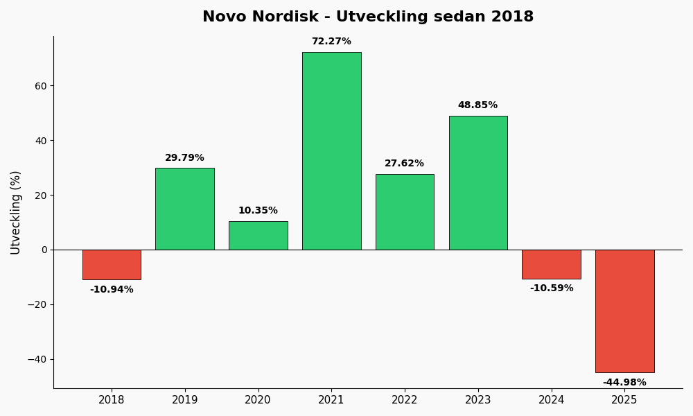 Sommaren 2024 började fallet ned till dagens nivåer. Aktien hade precis innan nått sin topp efter flera års kraftig uppgång. Drivkraften bakom den enorma uppgången var hypen kring medicinerna Ozempic och Wegovy. Ozempic utgör grunden för de enorma intäkterna. Ozempic används huvudsakligen i ett så kallat ”off label” fenomen, där medicinen egentligen var till för personer med typ 2-diabetes, men majoriteten av användarna använde det i syfte att gå ner i vikt. Läkemedelssubstansen som finns i både Ozempic och Wegovy heter Semaglutid. Den gör sitt arbete genom att efterlikna hormonet GLP-1, som i sin tur påverkar insulinet, sänker blodsockret och dämpar aptiten. Problemet var att diabetespatienter som verkligen behövde Ozempic hamnade i kläm på grund av lagerbrist.