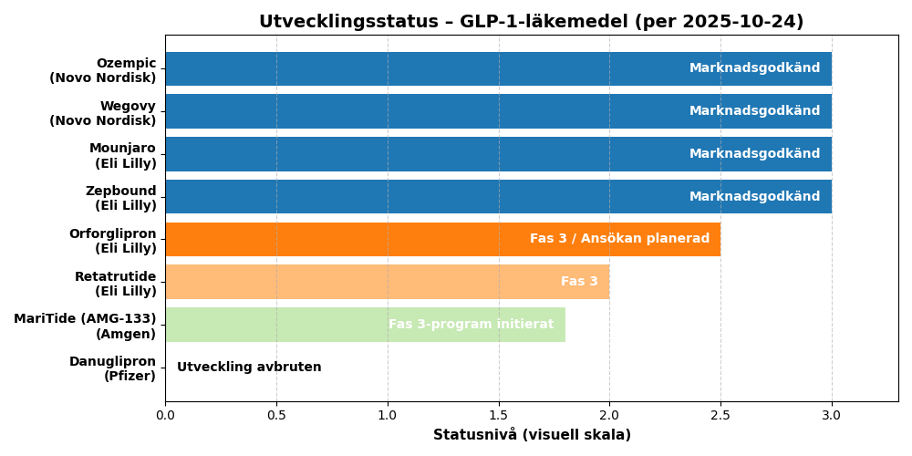 Året 2024 kulminerar för Novo Nordisk i december. Läkemedlet CagriSema som håller på att utvecklas ska bli nästa generations viktminskningsmedicin. Den kombinerar Semaglutid och Cagrilintid för att bli ännu mer effektiv. Men allt går inte som planerat, den 23 december så publiceras nya studier på CagriSema. Resultaten visade sig vara svagare än väntat och Novo Nordisk faller över 20 % på en dag. Veckorna går och utvecklingen skiftar sentimentet och marknaden inser att Novo Nordisk inte längre är ensam spelare inom GLP-1 läkemedel som vi ser på den här tabellen med utvecklingsstatus.