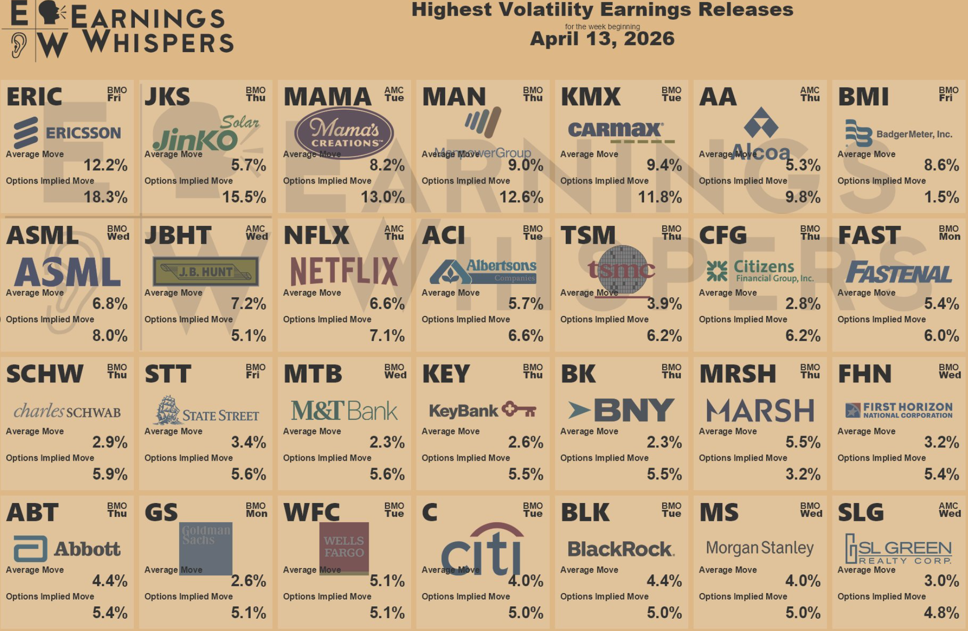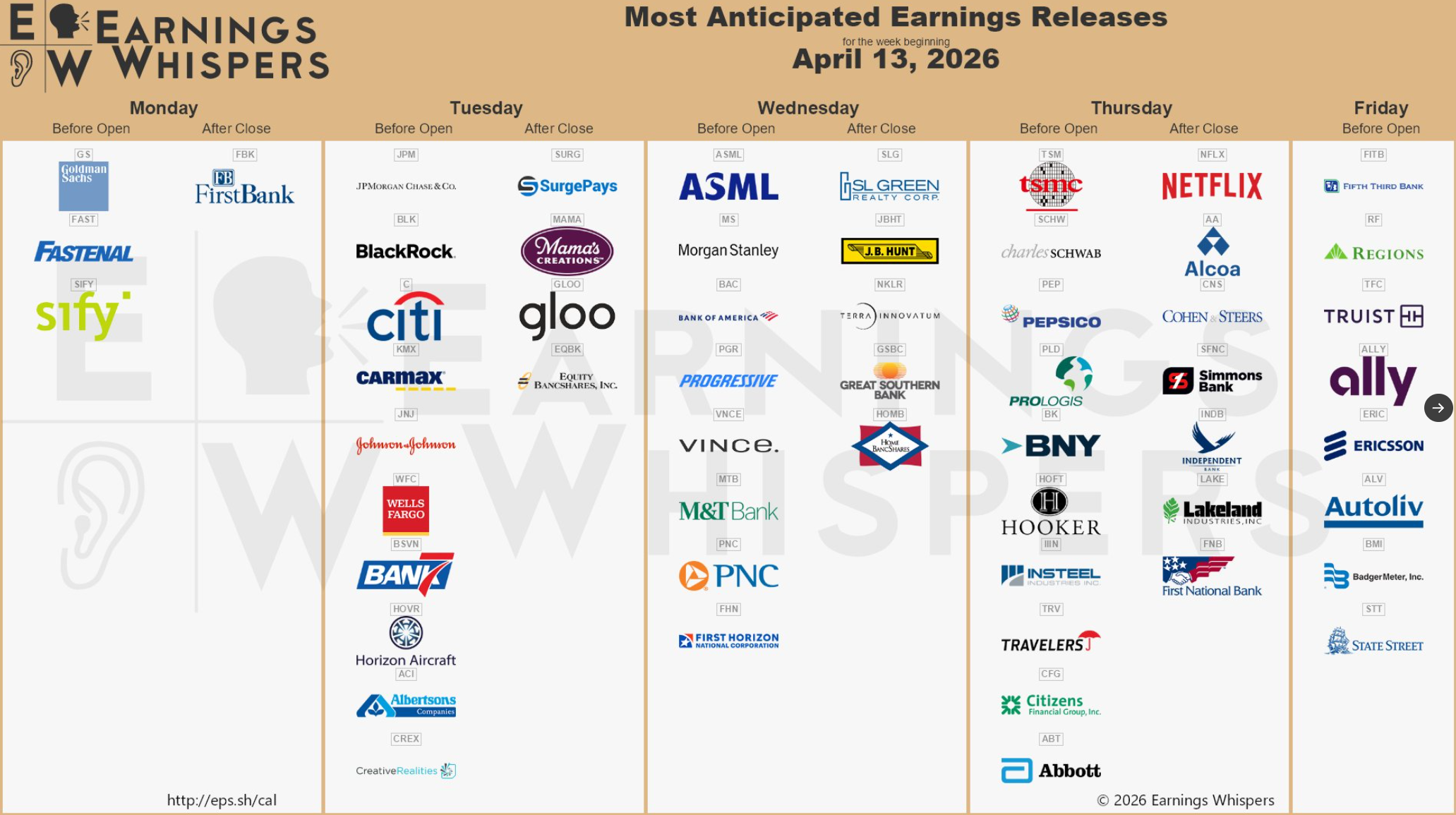 I USA är bankerna först ut i vanlig ordning med Goldman Sachs idag medan morgondagen bjuder på JP Morgan, Citi och Wells Fargo. Vad gäller AI och read over till sektorn i helhet bör onsdagens rapport från ASML och torsdagens siffror från TSMC komma att lusläsas av marknaden. Samtliga större rapporter från amerikanskt noterade aktier denna vecka enligt nedan bild från Earnings Whispers.