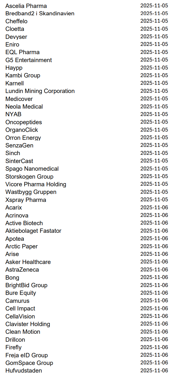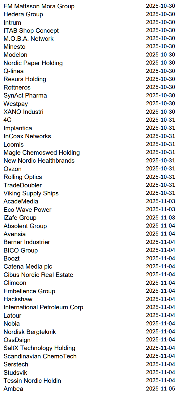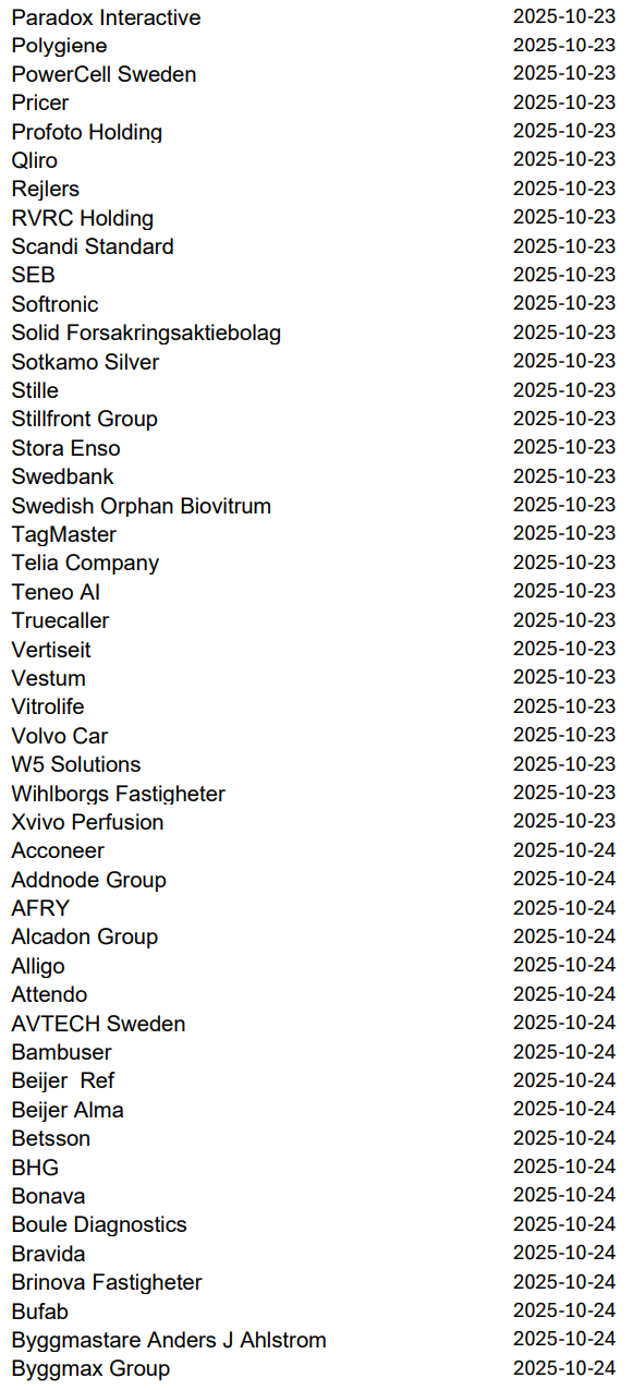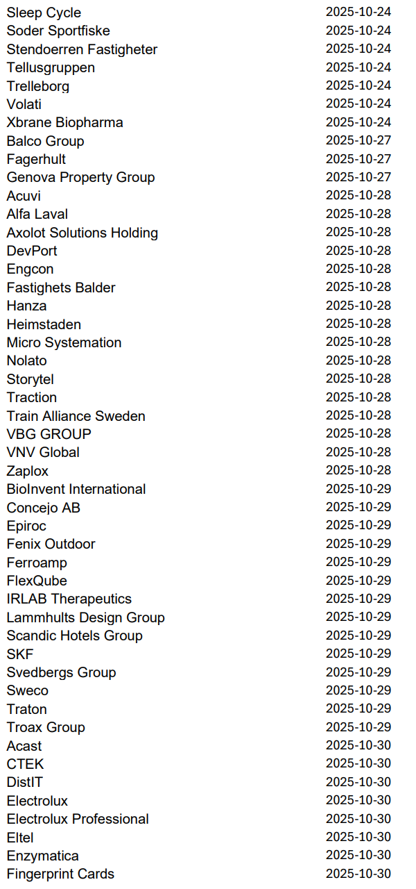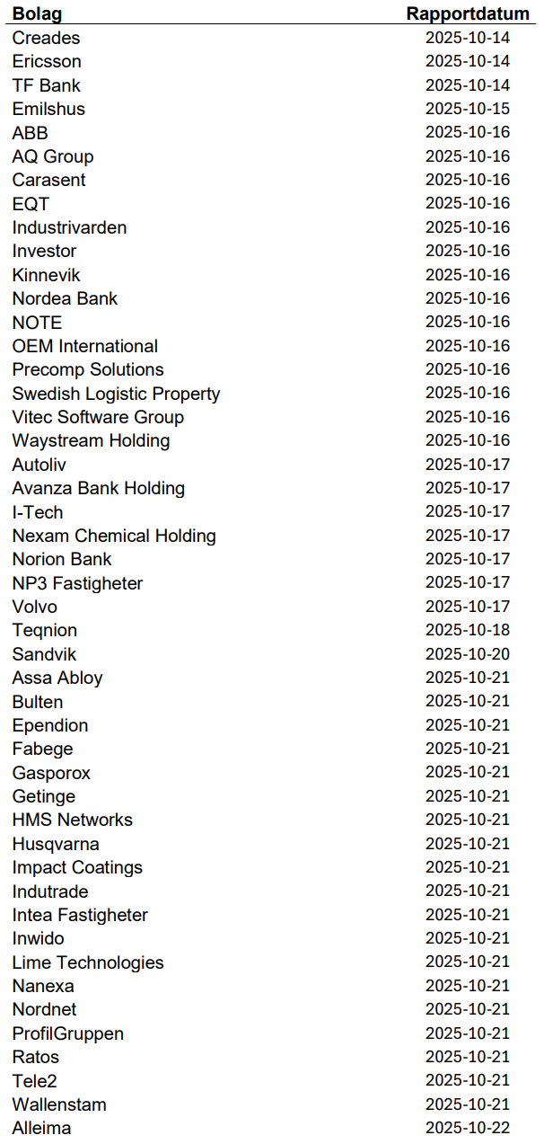 Imorgon rapporterar bland andra Volvo, Avanza, Autoliv, NP3 och Norion Bank, men nästa vecka släpper 219 svenska bolag sina kvartalsrapporter innan höstlovet. Då blir det korvstoppning på riktigt.