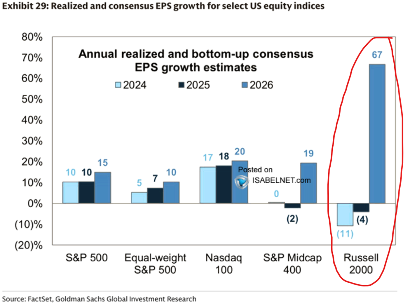 Som snitt för helåret 2026 väntas +15 % i vinsttillväxt för S&P 500 medan Nasdaq ska växa vinsterna med +20 % och längre ner i vegetationen väntas de riktigt stora vinstlyften komma med Mid Caps +19 % och Russell 2000 +67% efter två år med fallande vinster.