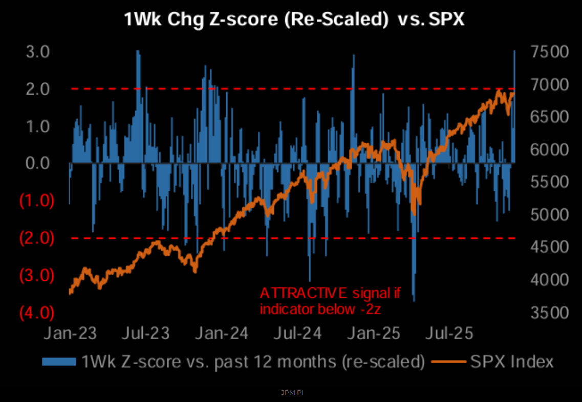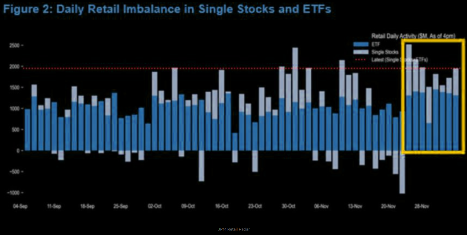 Perioden 25 november – 5 december öste amerikanska retail traders in över 2 bn USD per dag in i marknaden. Det är den lägsta perioden med stabilt köptryck från dessa investerare sedan september. Graf från JPM Retail radar nedan.
