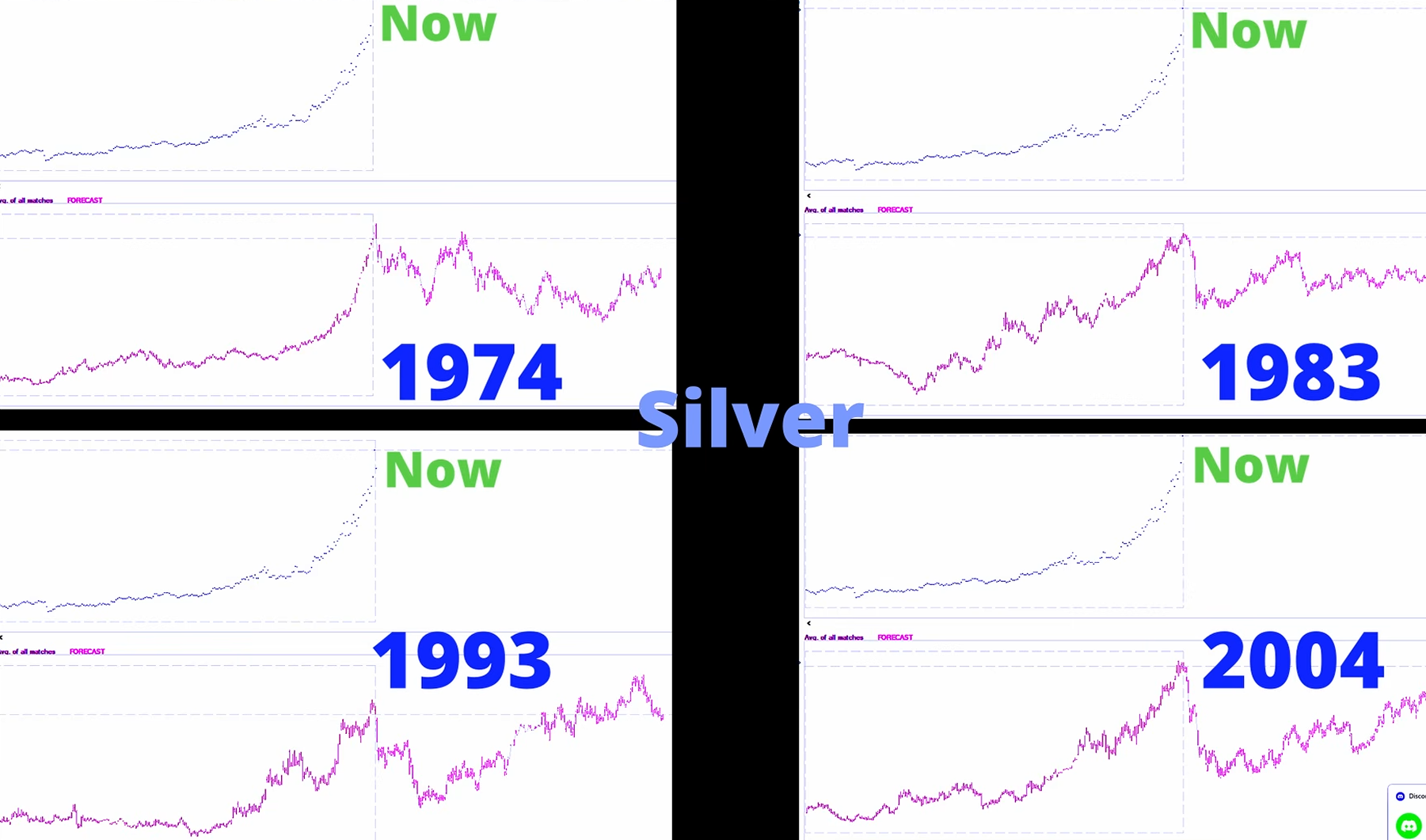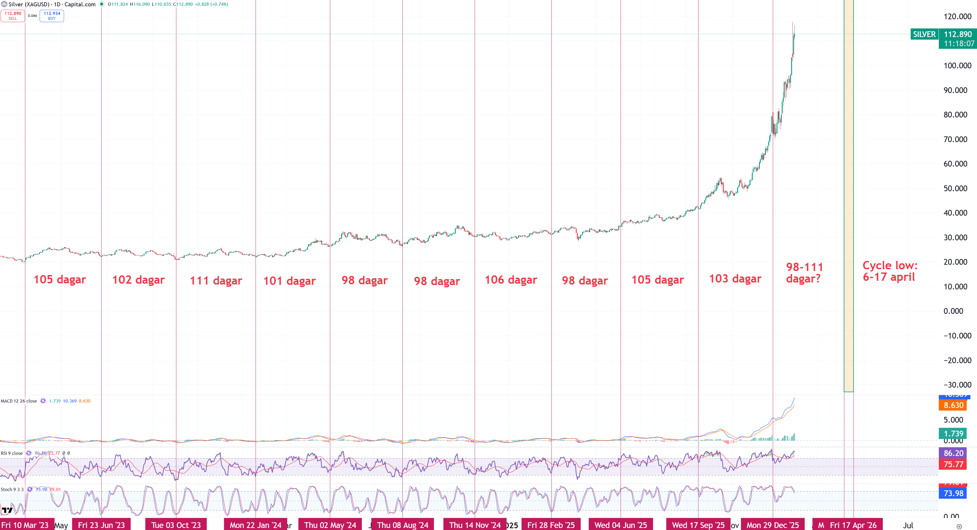 Först ut kikar vi på historiska cykler i silver och här ser vi tydliga likheter i dagens utveckling jämfört med uppgångarna 1974,1983,1993 och 2024. Samtliga av dessa tidigare gånger toppade rent tidsmässigt där vi befinner oss idag. Källa: Allen Reminick. Är man lång Silver här vid 113 USD kan man absolut fundera på att skala hem en del av positionen om inte annat. Obs, ingen rekommendation, utan mer en reflektion efter en uppgång på +290% på 1 år.