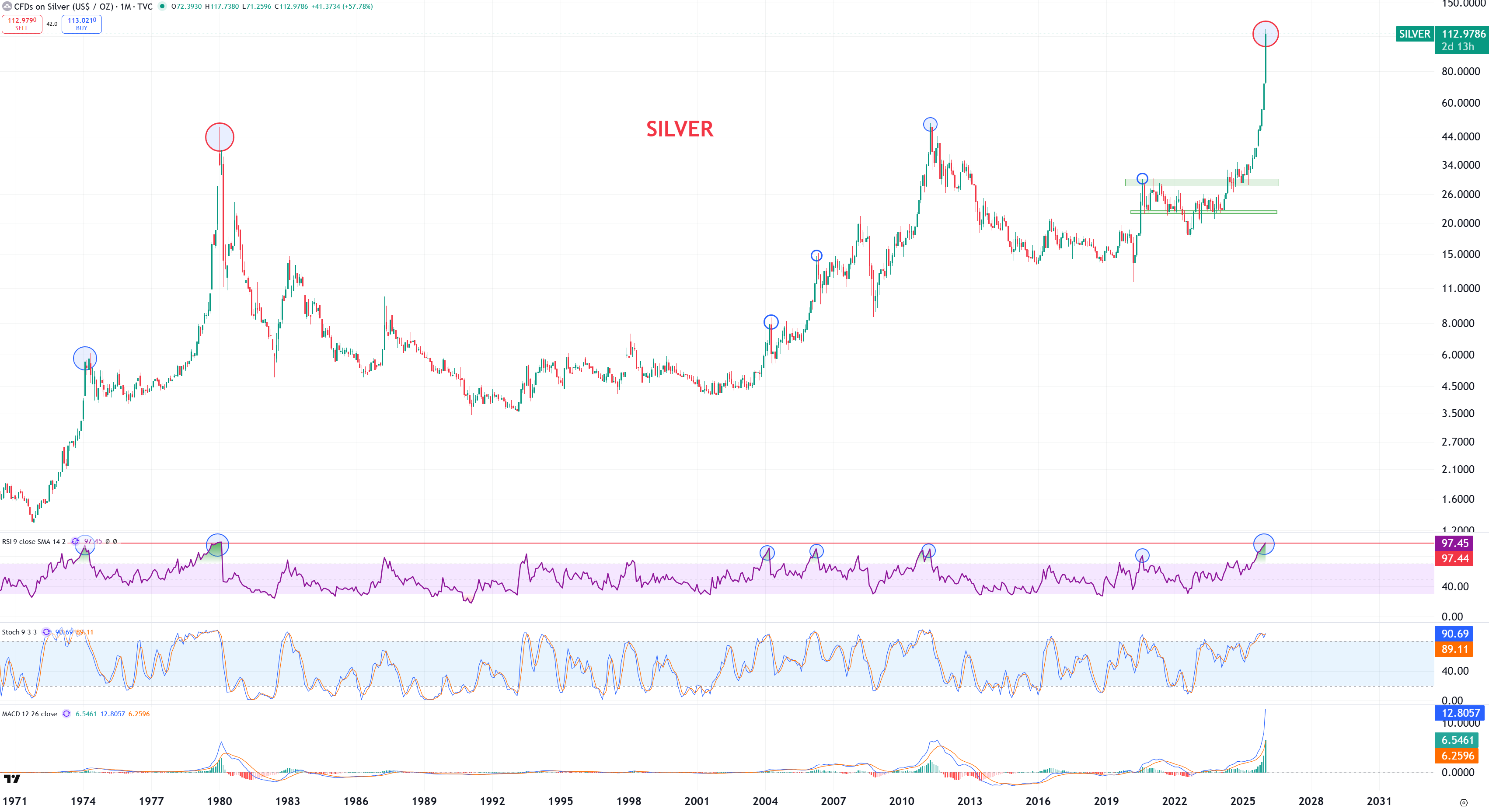 Tekniskt i månadsdiagrammet handlas nu silver med RSI(9) på 97,45, vilket är samma nivå som vid toppen i januari 1980. Den toppen återsågs sedan inte förens i april 2011. Hela 31 år senare. Även andra, lägre, spikar i RSI har historiskt inte varit då du vill köpa silver långsiktigt.