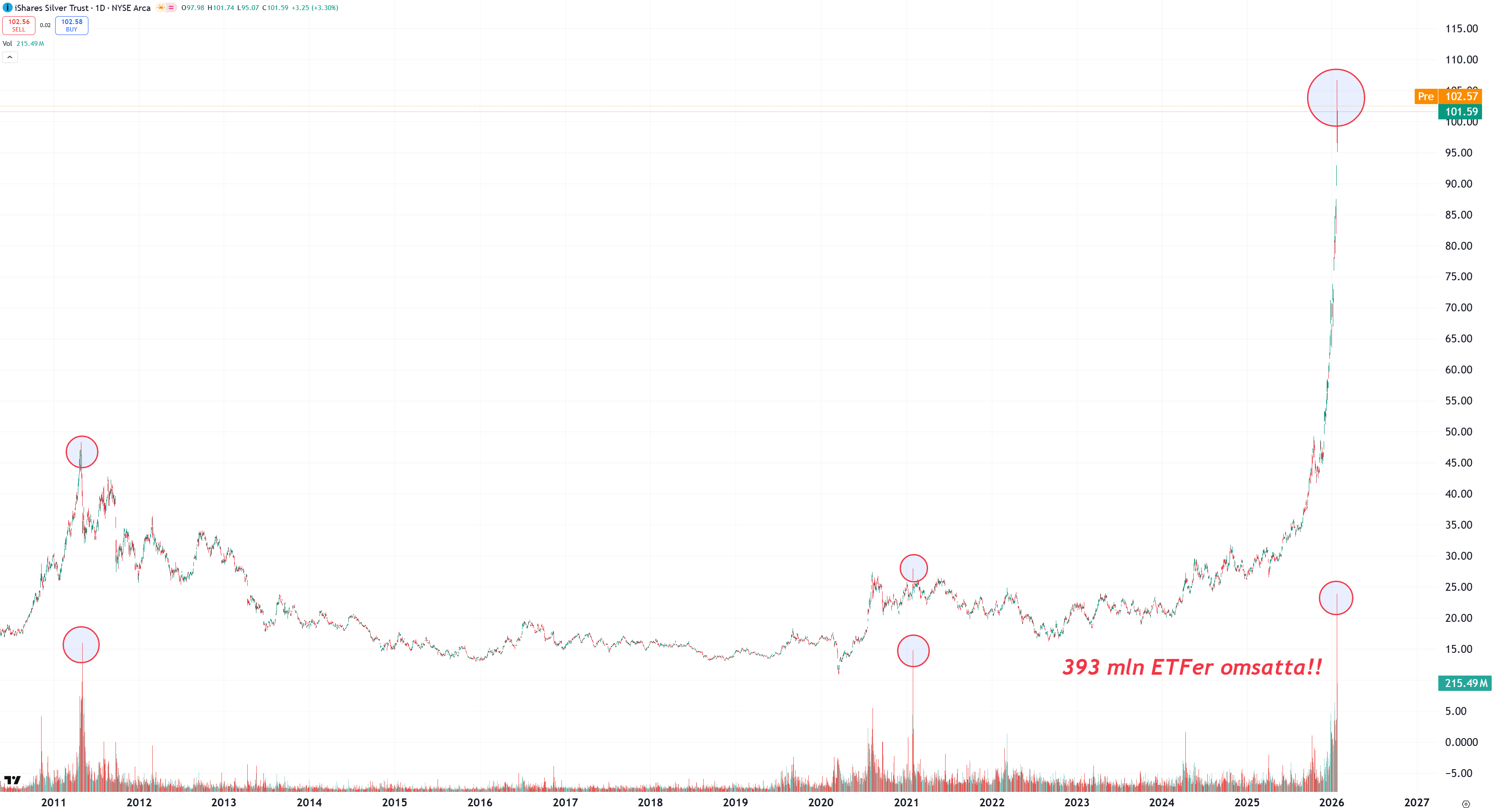 Världens största silver-ETF, SLV ETF, omsatte brutalt höga 393 mln ETF:er i måndags. Det är 15x mer än normalt och kännetecknar en klassisk “blow-off”! I dagsdiagrammet nedan är tidigare kraftiga “volymspikar” inringade.