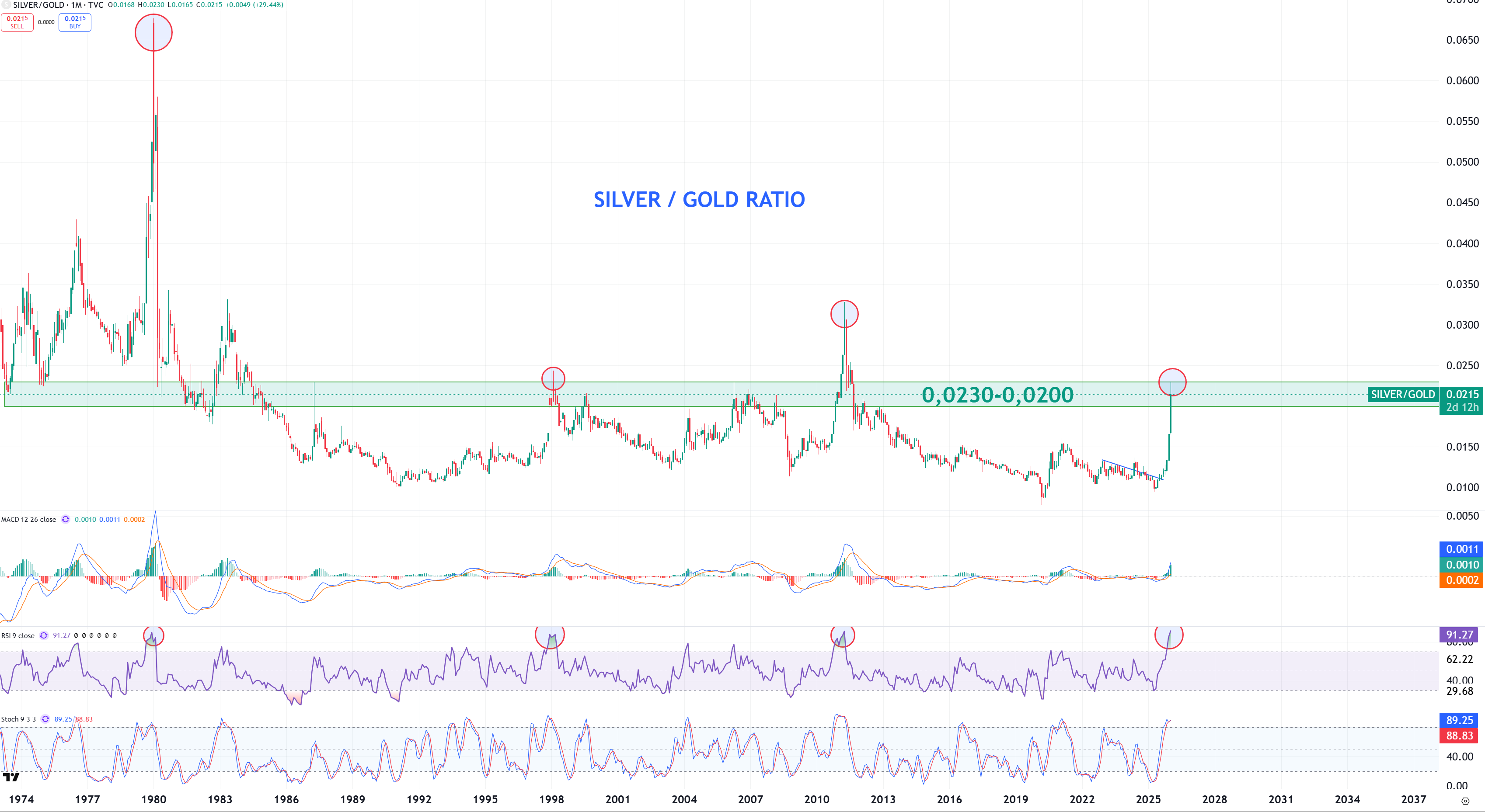 Silver har nu outperformat guldet med +123% sedan juni 2025. Relationen nådde 0,0230 tidigare i veckan, vilket är i övre delen av det historiska spannet 0,0230-0,0200 samtidigt som RSI(9) i månadsdiagrammet noteras med en spik på 91,27. Tidigare spikar i RSI är inringade i grafen nedan.