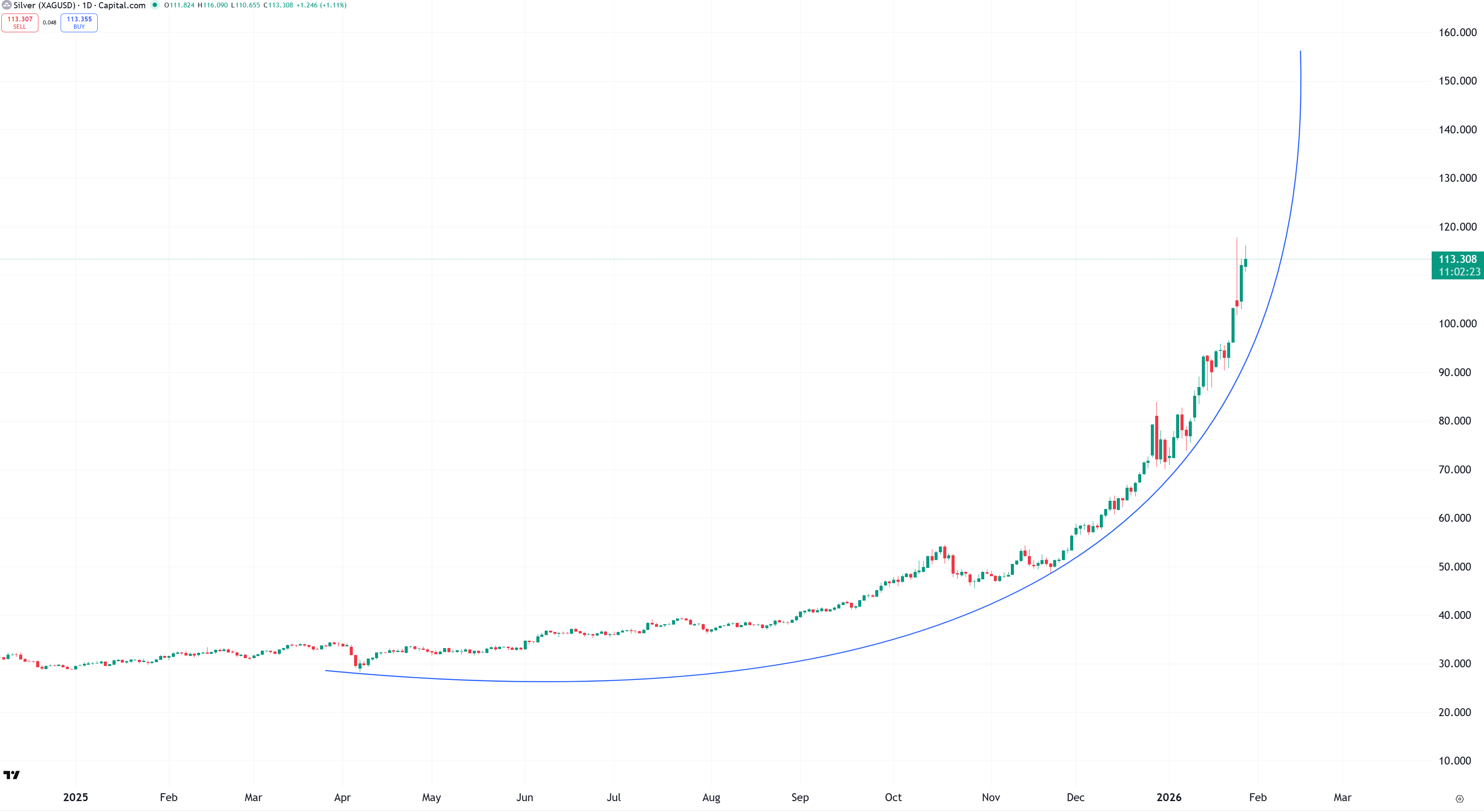 Det är som alltid svårt att veta exakt vart en parabolisk uppgång når sin absoluta toppnotering och i den här takten är 150 usd på horisonten för februari. Jag tvivlar dock på att vi når dit innan en större rekyl. På längre sikt kan silver absolut nu 250-500 usd, men det ser jag först om 10-20 år.